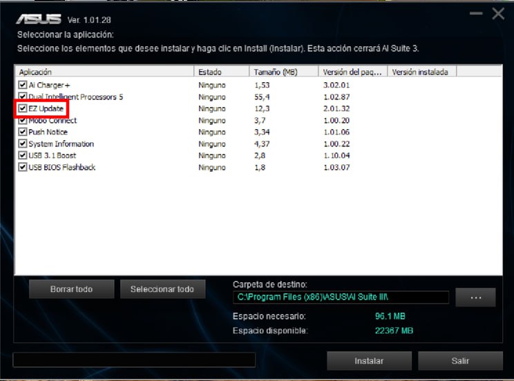 NOTE: The correct version is: ASUS AI Suite 3 V1.01.28 Install Program for Windows 7 32bit & 64bit / 8.1 64bit / 10 64bit. Version 1.01.28 205.7 MB 2015/11/10, it’s the most recent one that includes ASUS EZ Update.