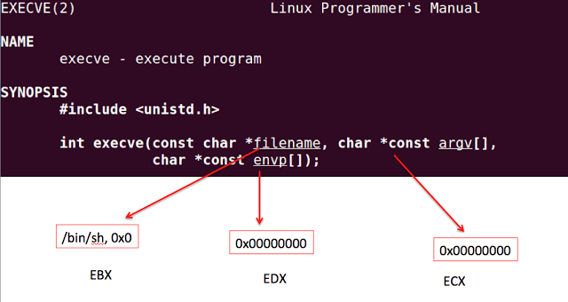 The first thing is to know what parameters the execve function needs and which register is responsible for each parameter: