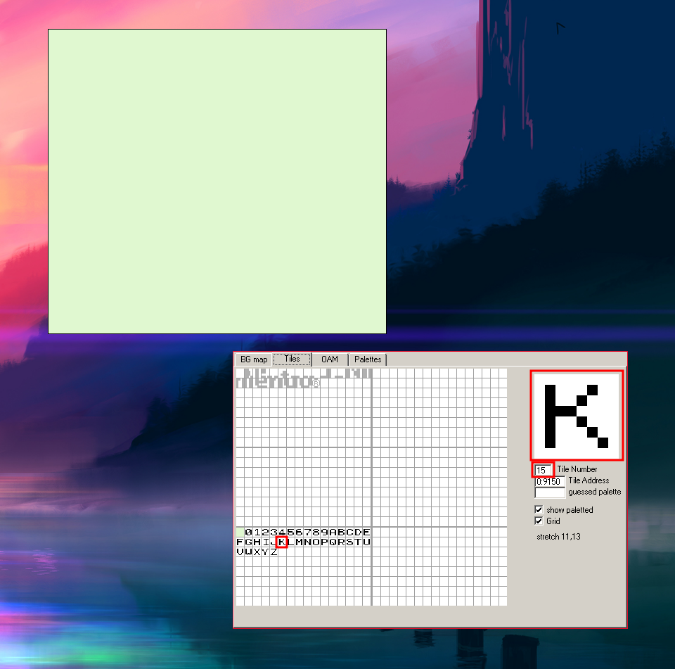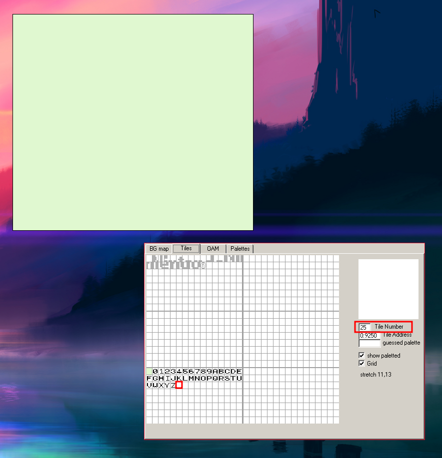First, we will address the problem of tile overlap since it is easier to solve of the two. To solve it, we will load the background tiles starting from position 0x25 -> 37, which is where the font tiles end: