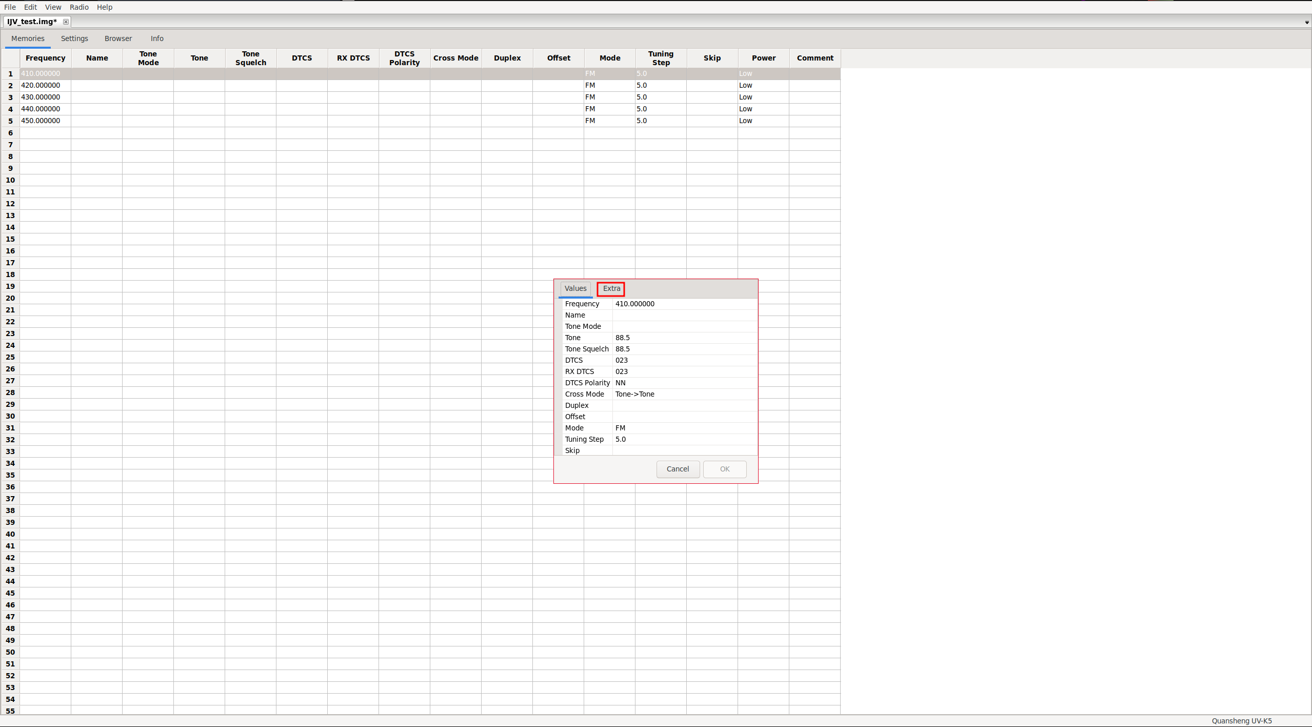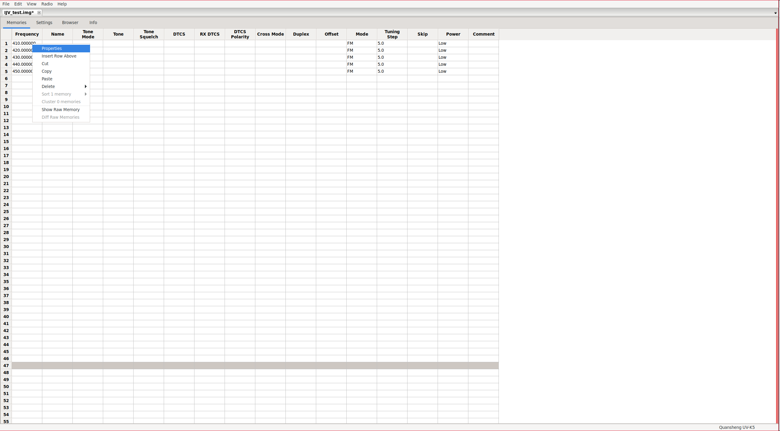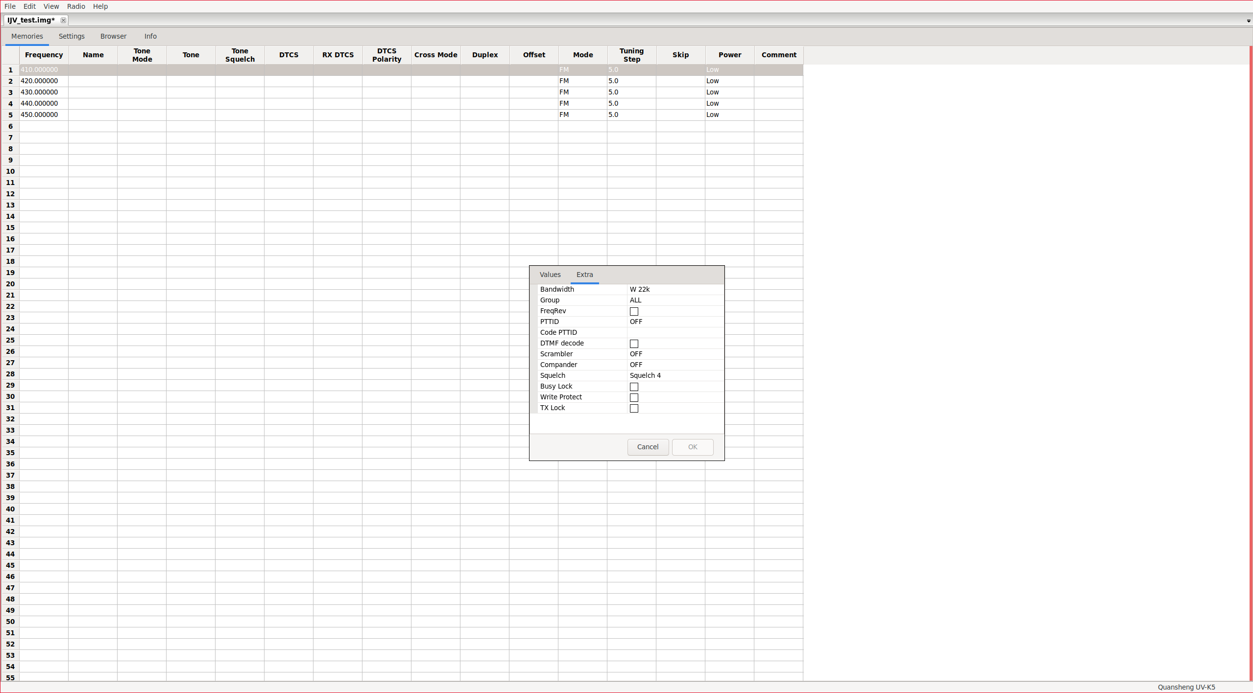 NOTE: For some reason, the option Tone -> is missing. This is a CHIRP issue, and I suppose they will fix these kinds of bugs over time. Remember that support for Quansheng is still experimental.