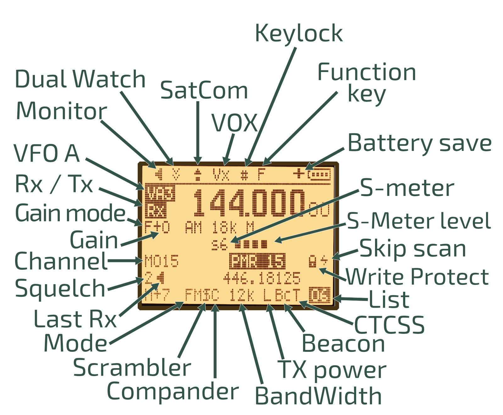 - AGC: Adjustment of the incoming signal gain. Manual for FM, automatic for AM and SSB.