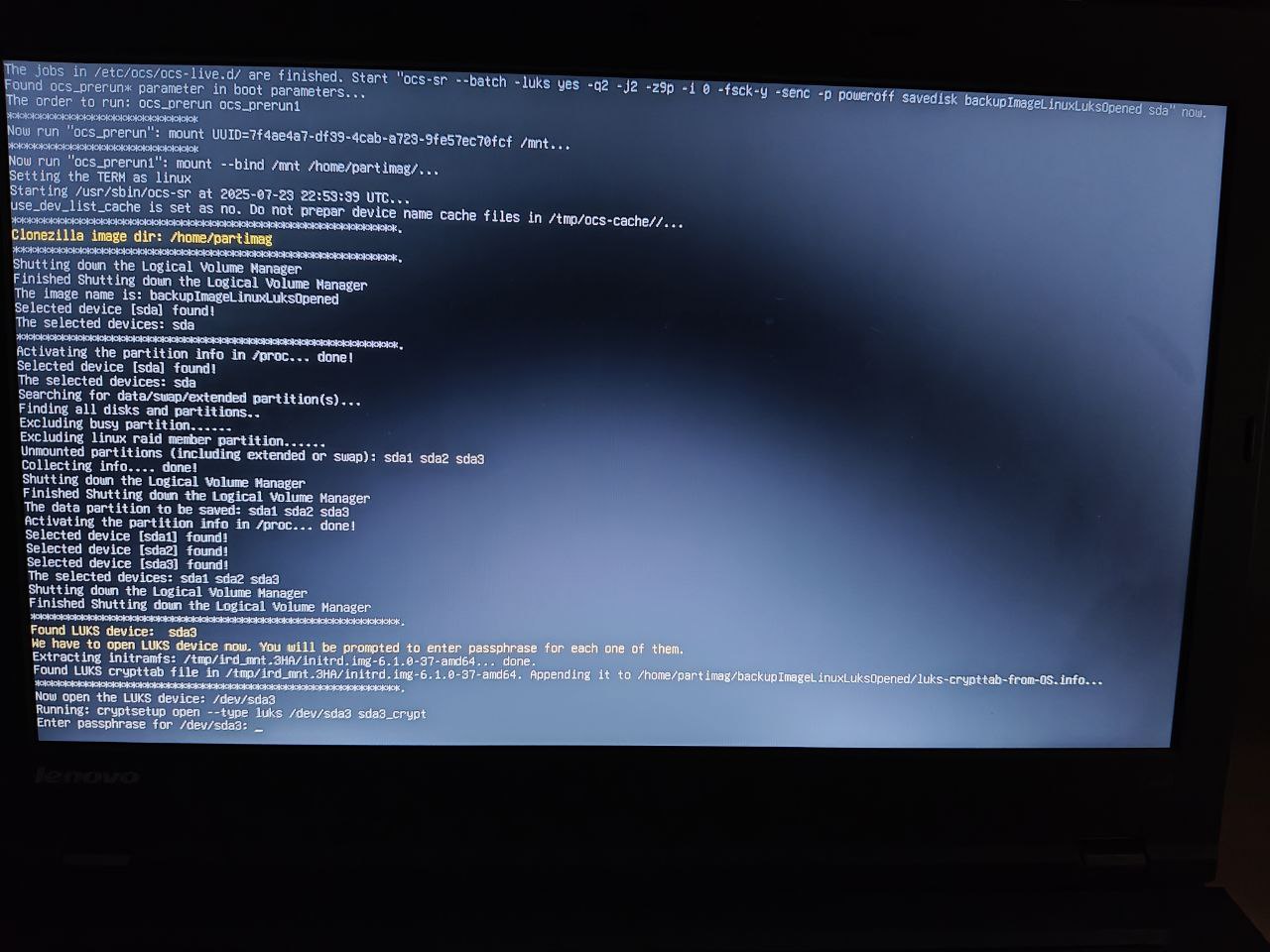 $linux_cmd /live/vmlinuz boot=live union=overlay username=user config components quiet loglevel=3 ocs_1_cpu_udev noswap edd=on nomodeset enforcing=0 noeject locales=en_US.UTF-8 keyboard-layouts=us ocs_prerun="mount UUID=7f4ae4a7-df39-4cab-a723-9fe57ec70fcf /mnt" ocs_prerun1="mount --bind /mnt /home/partimag/" ocs_live_batch="yes" ocs_live_run="ocs-sr --batch -g auto -e1 auto -e2 -r -j2 -k0 -p poweroff restoredisk backupImageLinuxLuksClosed sda" ocs_live_extra_param="" vga=788 net.ifnames=0 nosplash i915.blacklist=yes radeonhd.blacklist=yes nouveau.blacklist=yes vmwgfx.enable_fbdev=1 scsi_mod.use_blk_mq=0 nvme.poll_queues=1