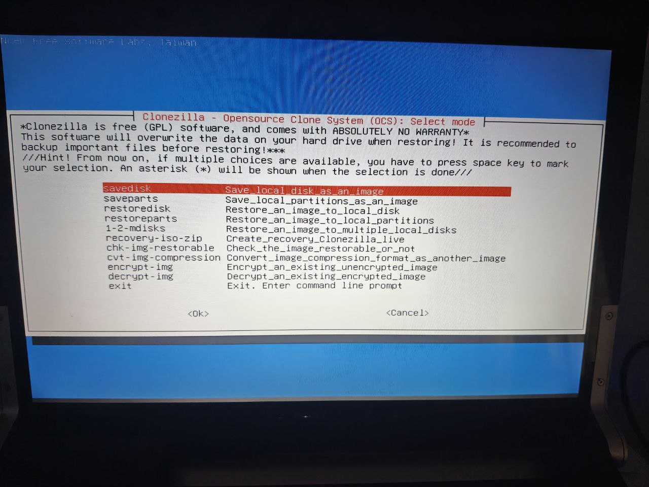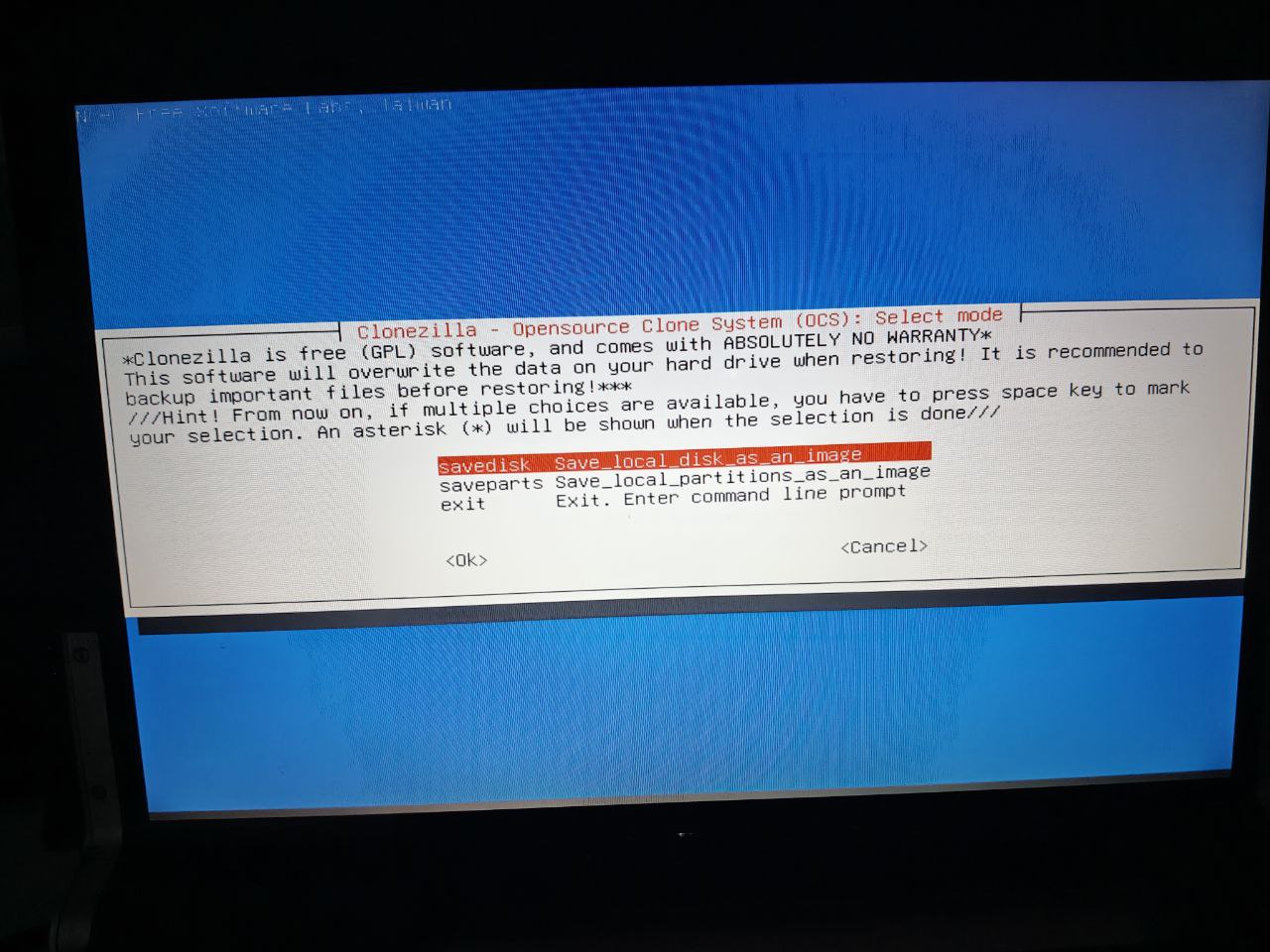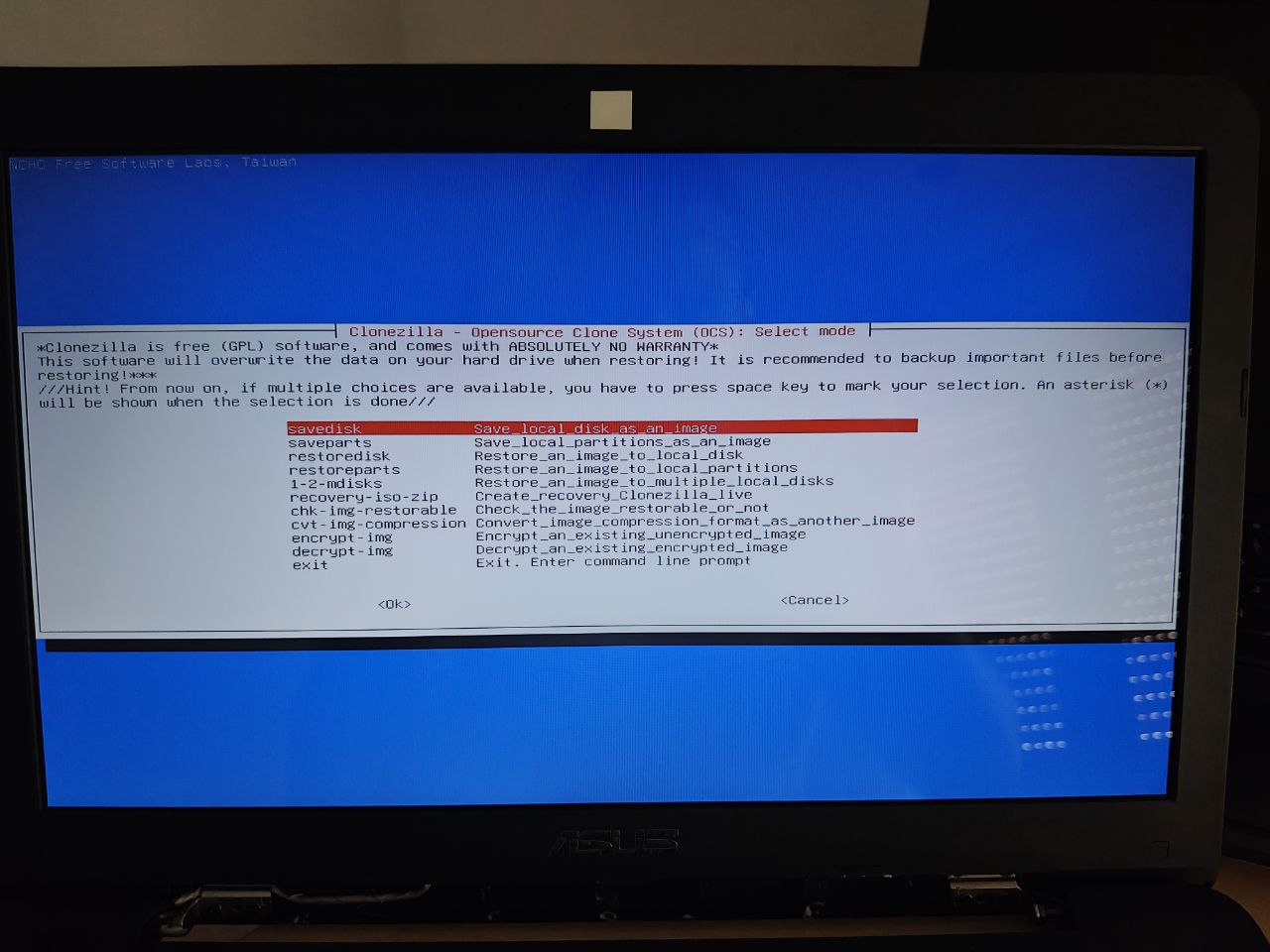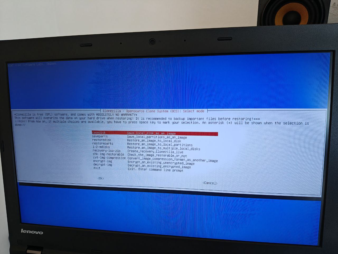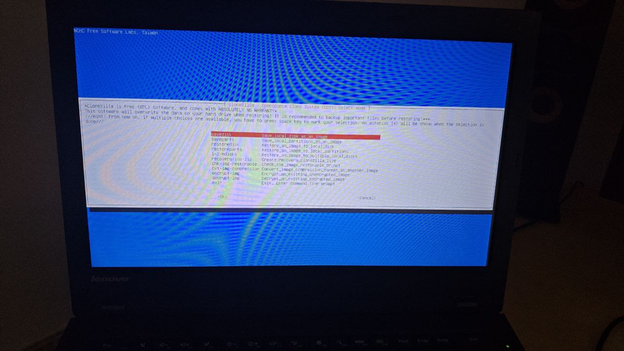 Clonezilla es un software de clonado de sistemas en base a imágenes de disco, este puede ser arrancado desde un CDROM/USB/HD permitiendo realizar las operaciones de backup desde un sistema ajeno al contenido del PC.