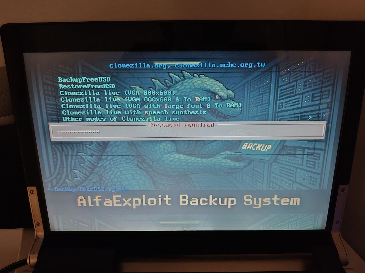 Clonezilla permite cifrar los datos backupeados de tal manera que sin esta no es posible leer ni restaurar los datos, esto puede resultar un arma de doble filo en caso de no recordar el password de un backup antiguo, yo no recomiendo cifrar, si no guardar en un lugar seguro el disco.