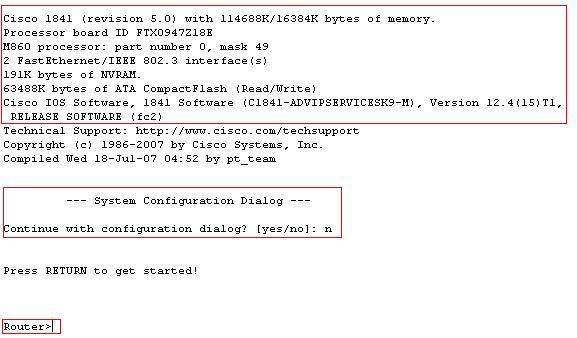 Una vez termina el proceso de arranque nos preguntará si queremos utilizar el asistente de configuración, contestaremos que NO y ya estamos casi listos para empezar a configurar nuestro router. En este momento estaremos en modo sin privilegios (Router>). Desde este modo podemos utilizar comandos únicamente para obtener información o hacer pruebas de conectividad pero no podremos configurar nada.