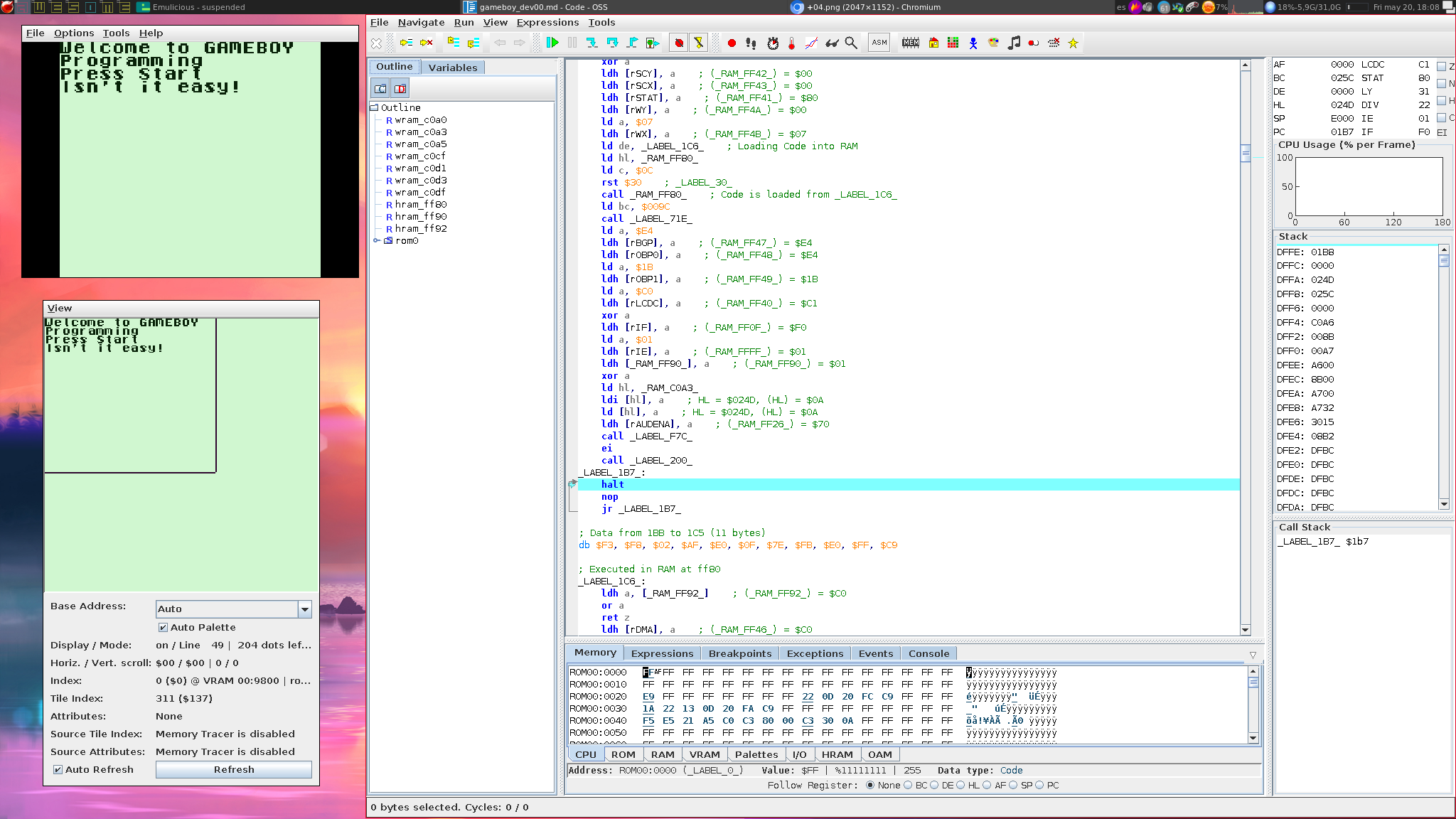 En este artÃculo prepararemos el entorno de desarrollo necesario para programar juegos en C utilizando GBDK , para ello utilizaremos la capa de compatibilidad binaria de Linux ya que GBDK requiere de una versión de SDCC parcheada y compilarlo en FreeBSD resulta muy complicado, creedme lo he intentado. Además instalaremos el emulador/debugger Emulicious el cual nos ayudará a visualizar de forma gráfica el estado del microprocesador, la memoria del sistema y la memoria de video.