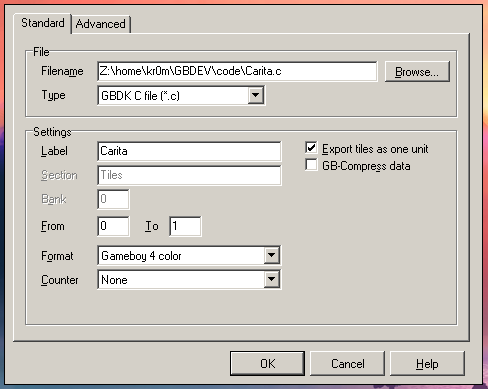 Lo guardamos con el nombre Carita como fichero GBDK C file, asignamos un nombre al array dentro del fichero C, este contendrá los hexcodes que representarán el sprite, lo guardamos como una única unidad, guardamos del frame 0 al 1 ya que tiene dos tiles y formato 4 colores(escala de grises).
