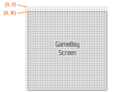 La GameBoy presenta una particularidad y es que las coordenadas 0,0 no corresponden con el principio de la pantalla si no las 8, 16: