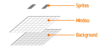 | - Background: Fondo de los niveles del juego. - Sprites: Elementos móviles como personajes o enemigos. - Window: Parte donde se muestra nformación como la puntuación, vidas y demás elementos informativos. |
