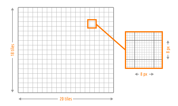 | - Cada tile es de 8×8 pixels. - La pantalla es de 160x144 pixels -> 20x18 tiles. |