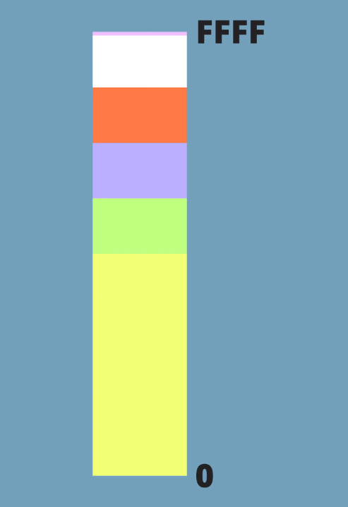 El espacio de direcciones de memoria de la GameBoy es de 16 bits lo que nos dá 65535 posiciones de 8 bits cada una que en kilobytes equivale a 64KB, el rango de direcciones empieza en 0x0000 y termina en 0xFFFF.