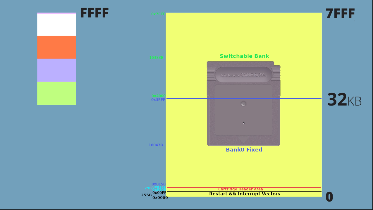 Hay una peculiaridad en cuanto al primer banco de ROM y es que este tiene un tamaño reducido ya que sus 16KB están compartidos con el “inicio de la GB + vectores de interrupción” y “la cabecera del cartucho”: