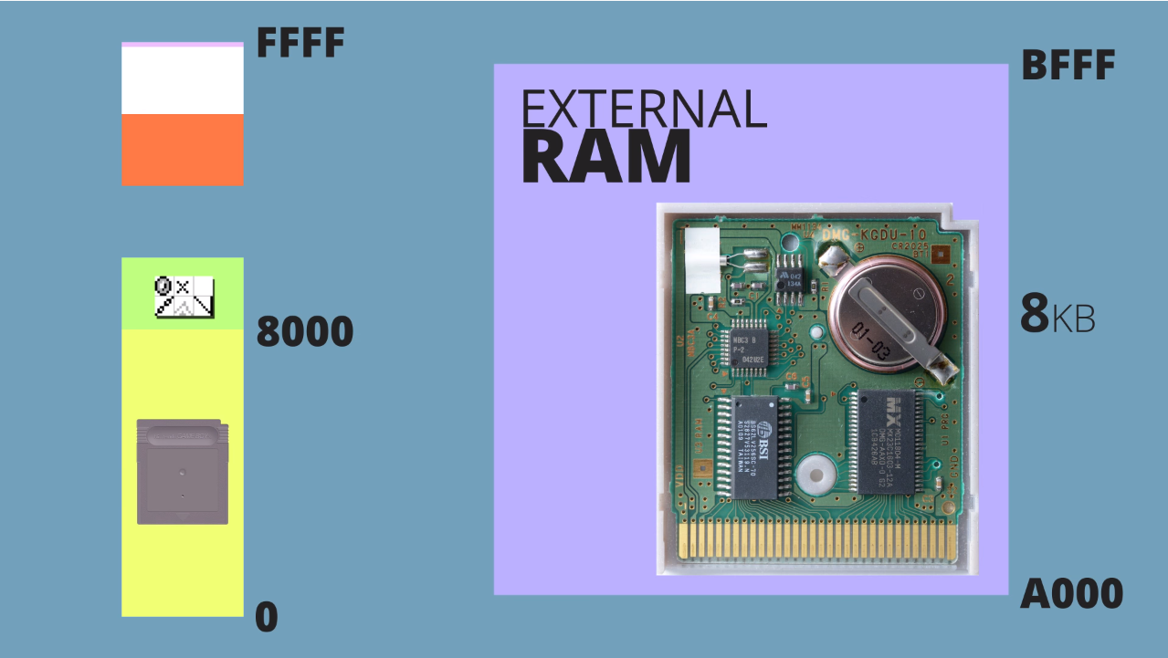 La RAM externa suele venir acompañada de una batería de este modo es posible guardar datos de usuario que persisten entre inicios de la máquina, la RAM externa es igual de rápida que la interna por este motivo algunos desarrolladores han llegado a utilizar parte de la RAM con batería como RAM de uso normal y no para guardar datos. Algunos cartuchos sin MBC podían llevar RAM pero necesitaban un chip similar para funcionar.
