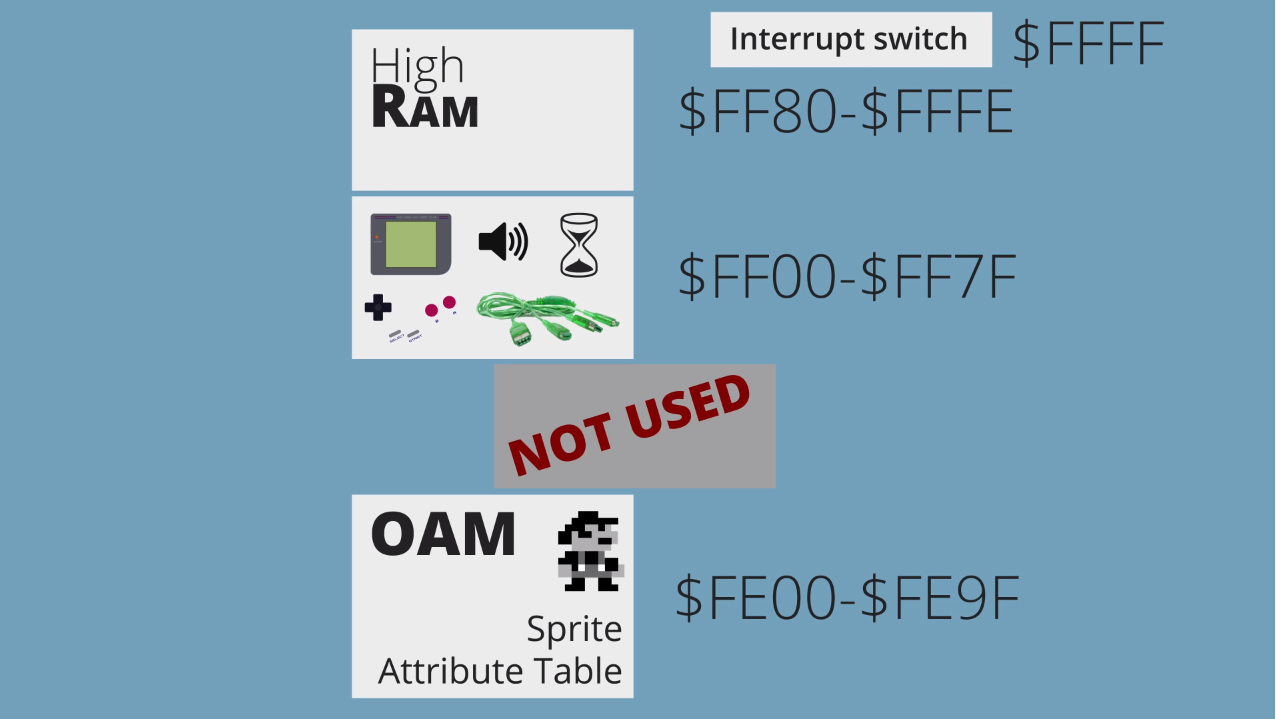 | 0xFE00 - 0xFE9F | OAM | 159 bytes |