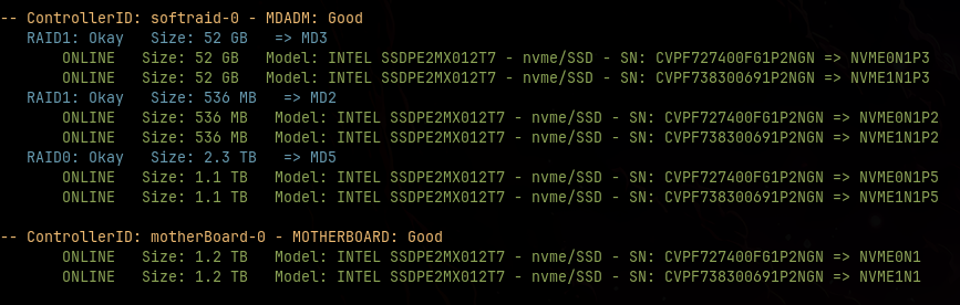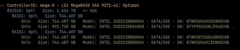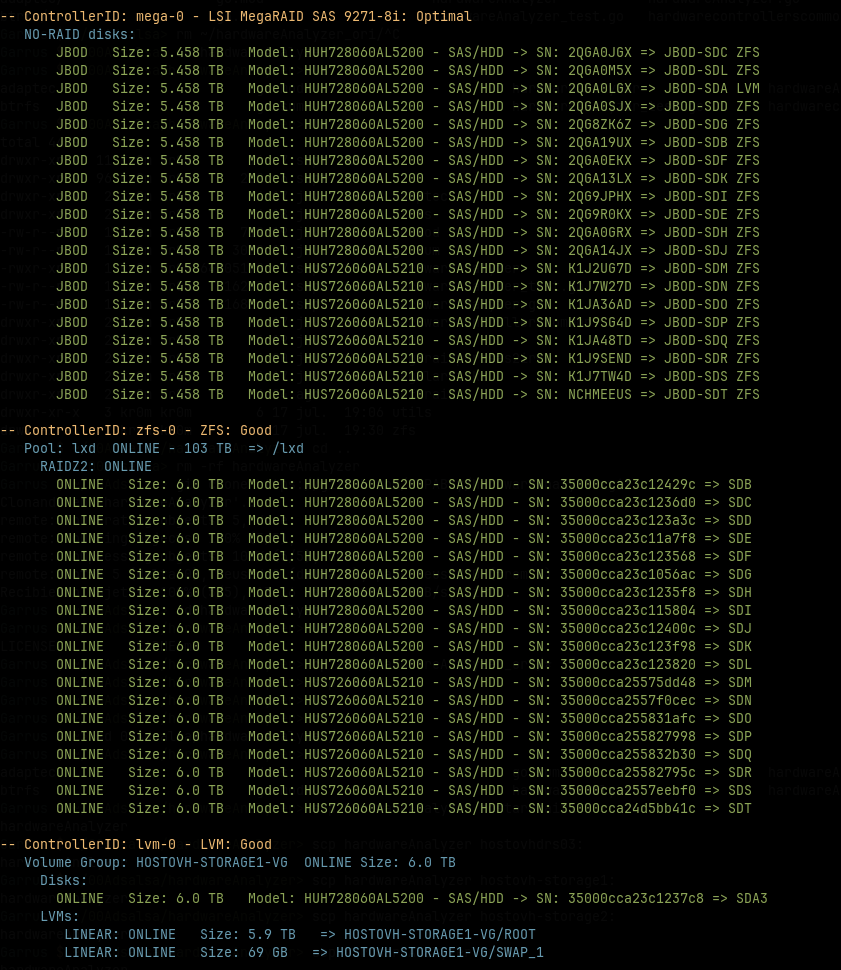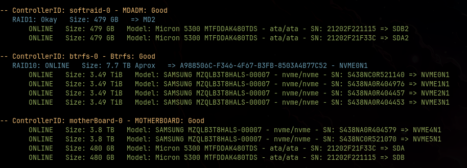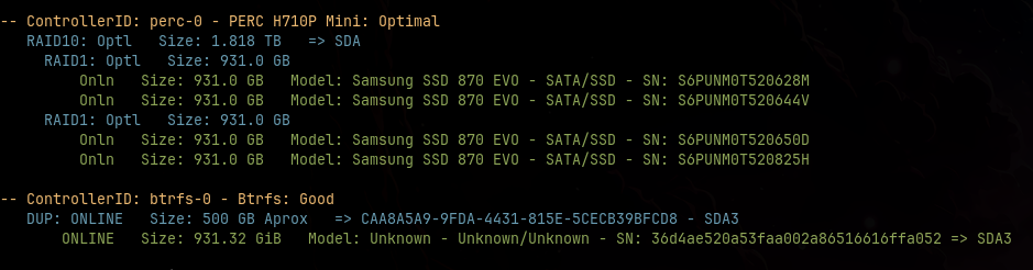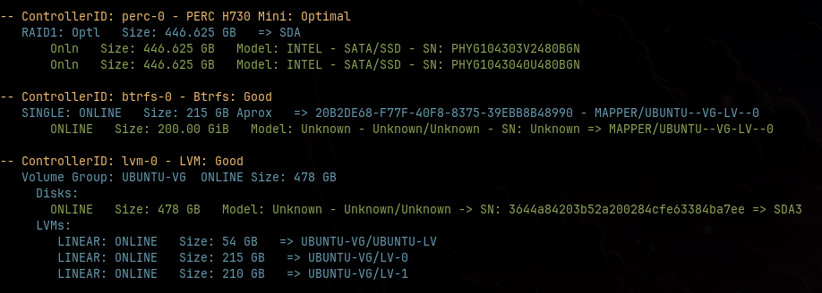 Esto incluye los fabricantes: MegaRaid/PERC/SAS2IRCU/ADAPTEC, los raids por SoftRAID/ZFS/Btrfs/LVM y los discos conectados directamente a la placa base.