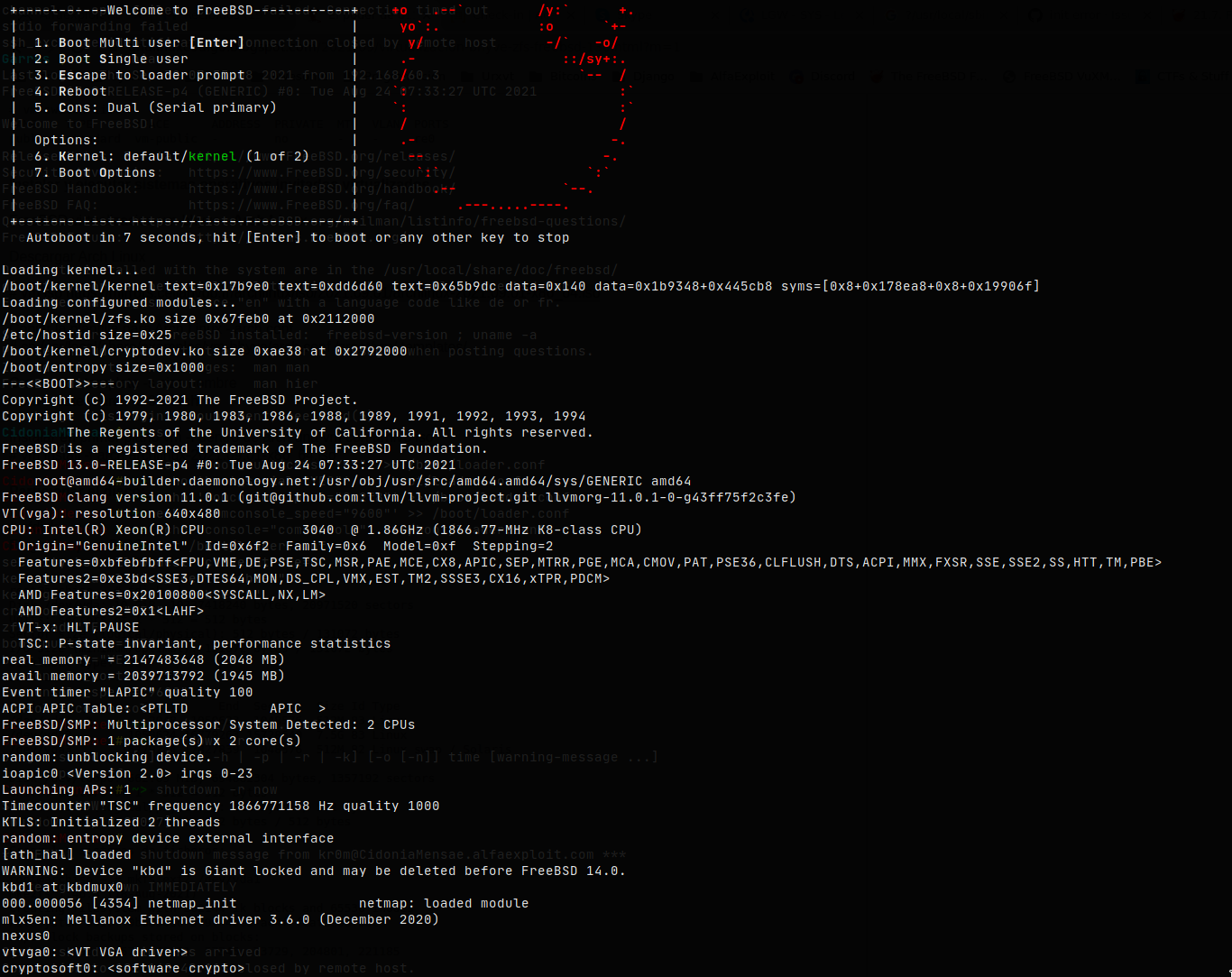 El instalador de FreeBSD por defecto está disponible tanto por la salida VGA como por la salida del puerto serie, pero solo es el menú de inicio, si presionásemos ENTER la instalación seguiría solo por la salida VGA, para poder realizar la instalación por puerto serie debemos indicar algunos parámetros: