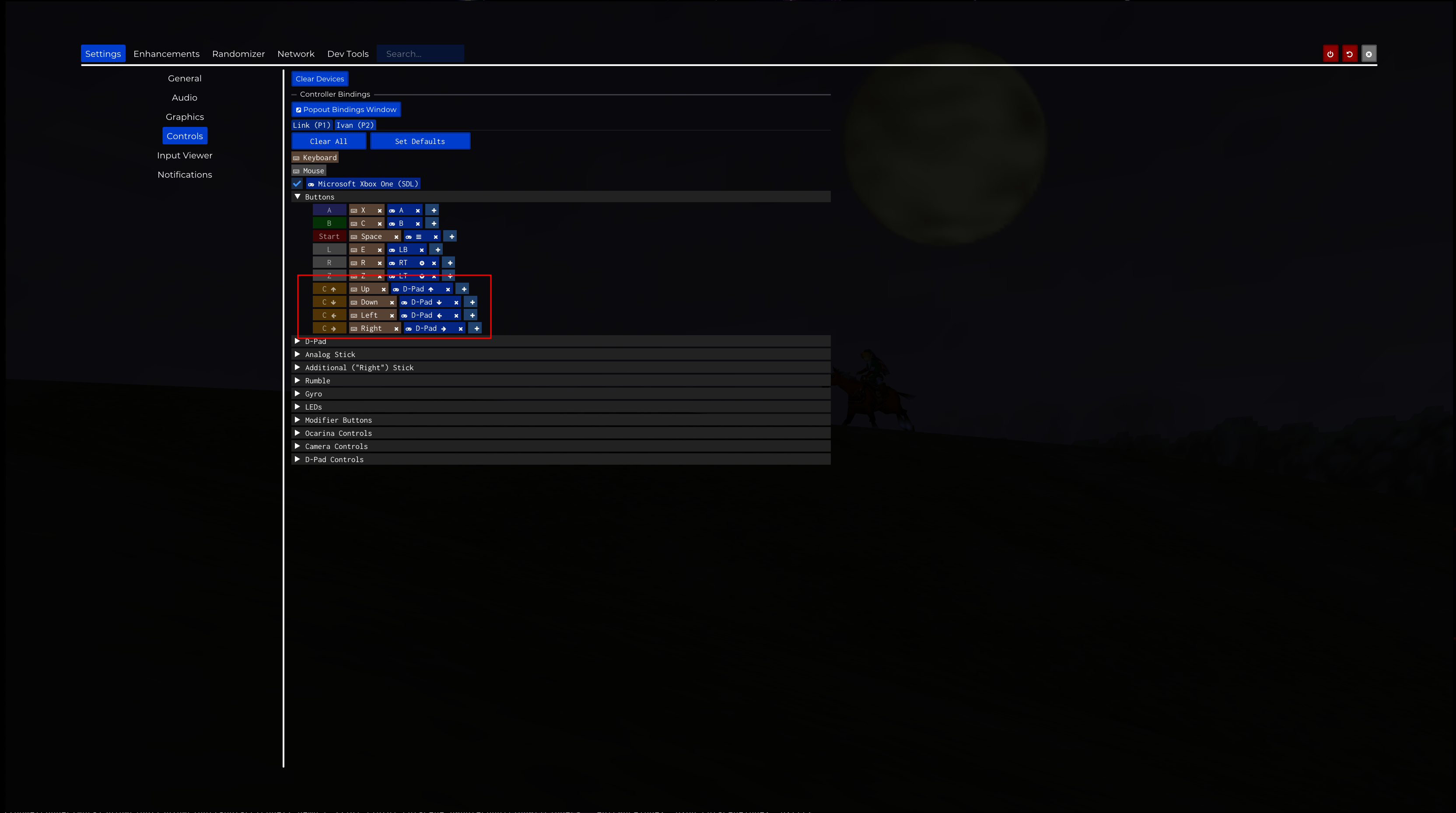 Esc: Settings -> Controls -> Buttons -> C(Up/Down/Left/Right): D-Pad(Up/Down/Left/Right)
