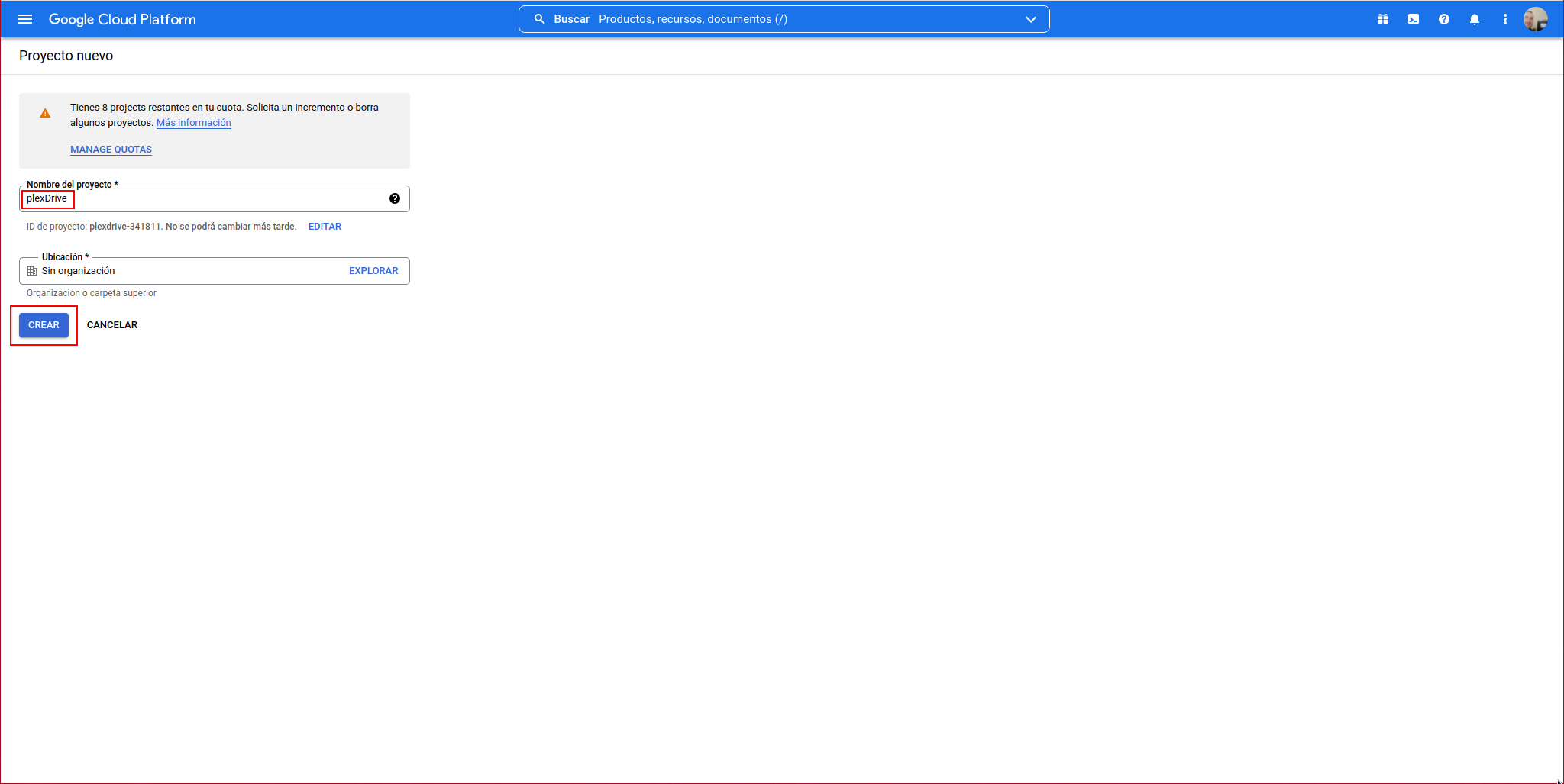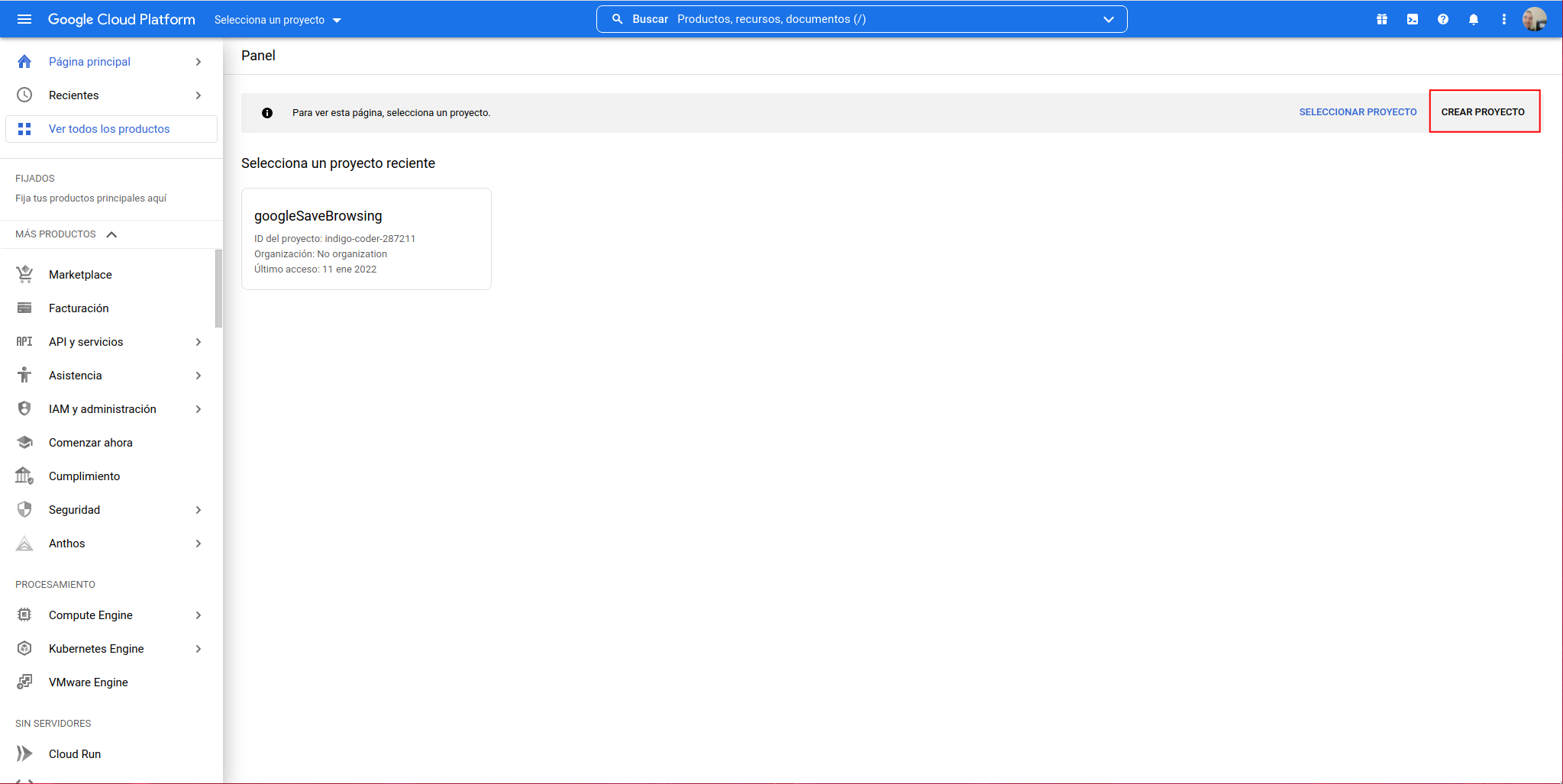 Al acceder a la URL mostrada nos aparecerá la siguiente interfaz donde debemos darle al botón de la derecha “CREAR PROYECTO”: