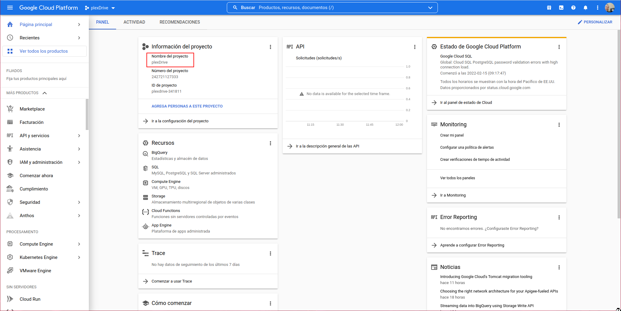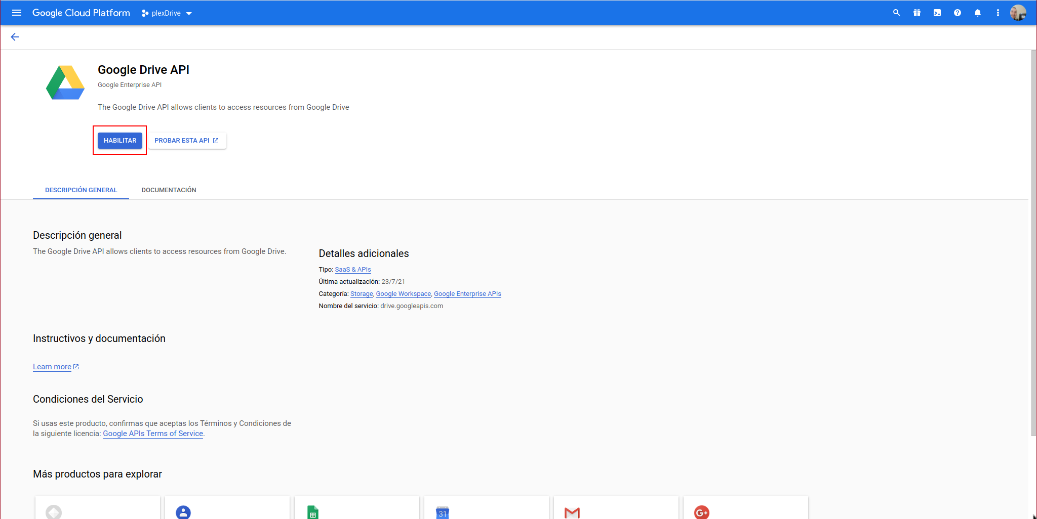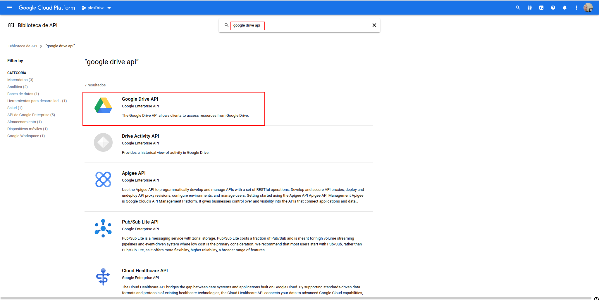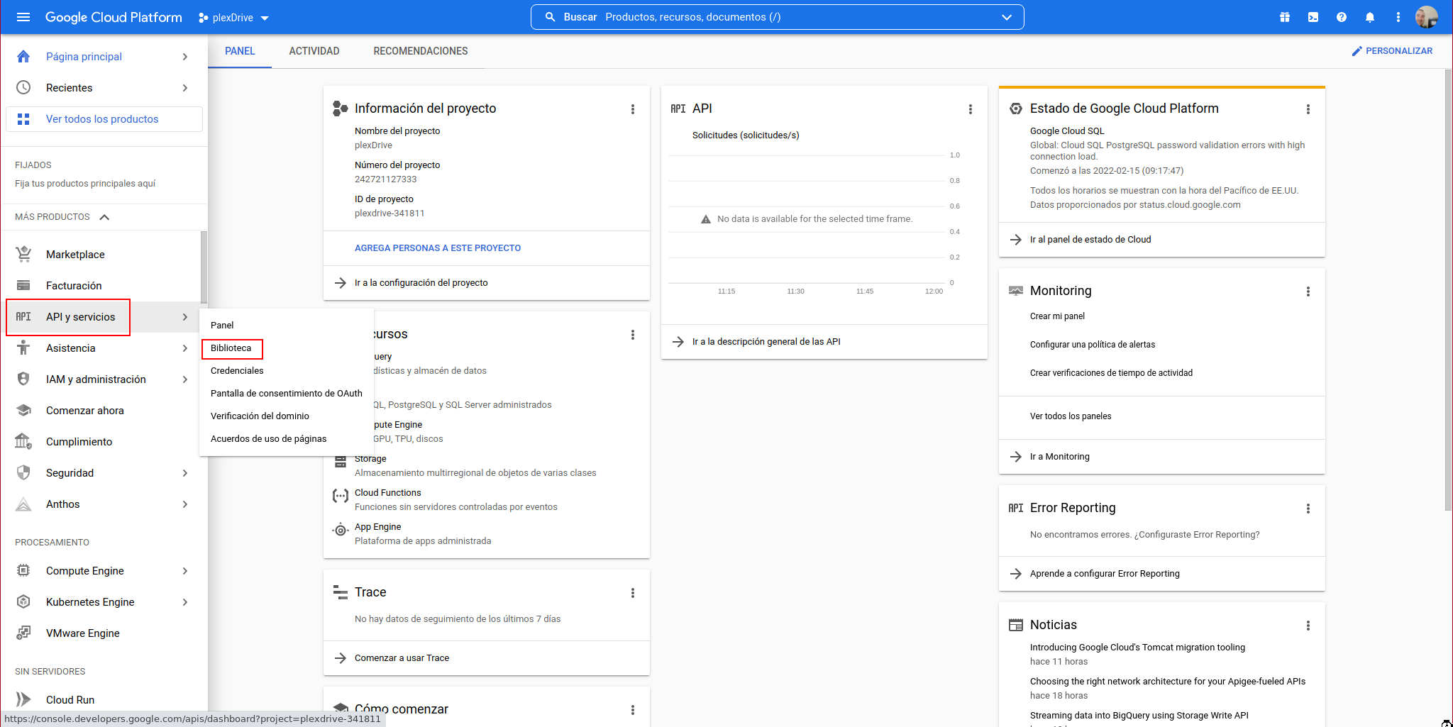 Activamos la API de Google drive en el proyecto, para ello accedemos a “API y servicios” -> Biblioteca: