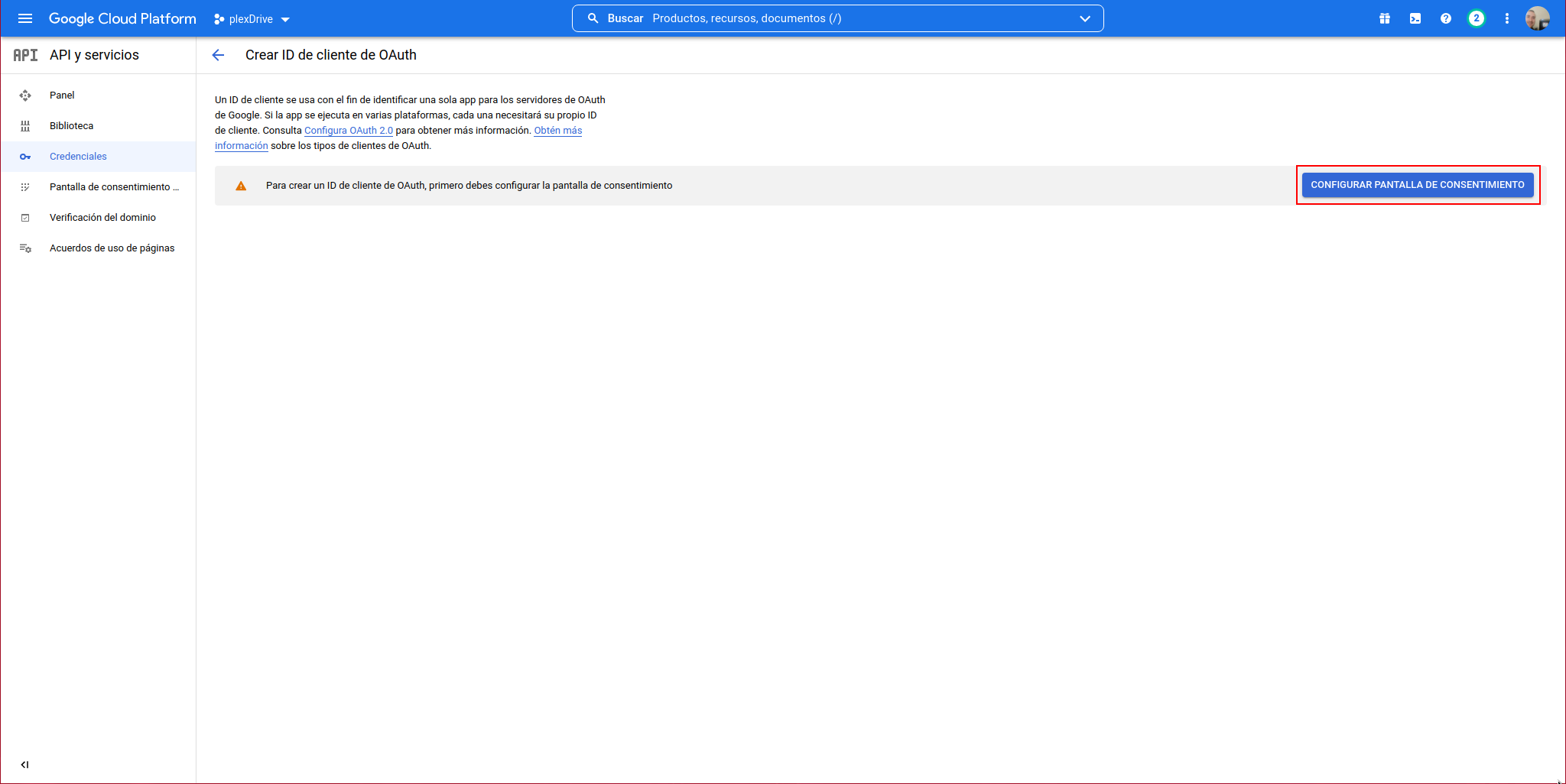 Nos aparecerá la siguiente ventana donde debemos darle a “CONFIGURAR PANTALLA DE CONSENTIMIENTO”: