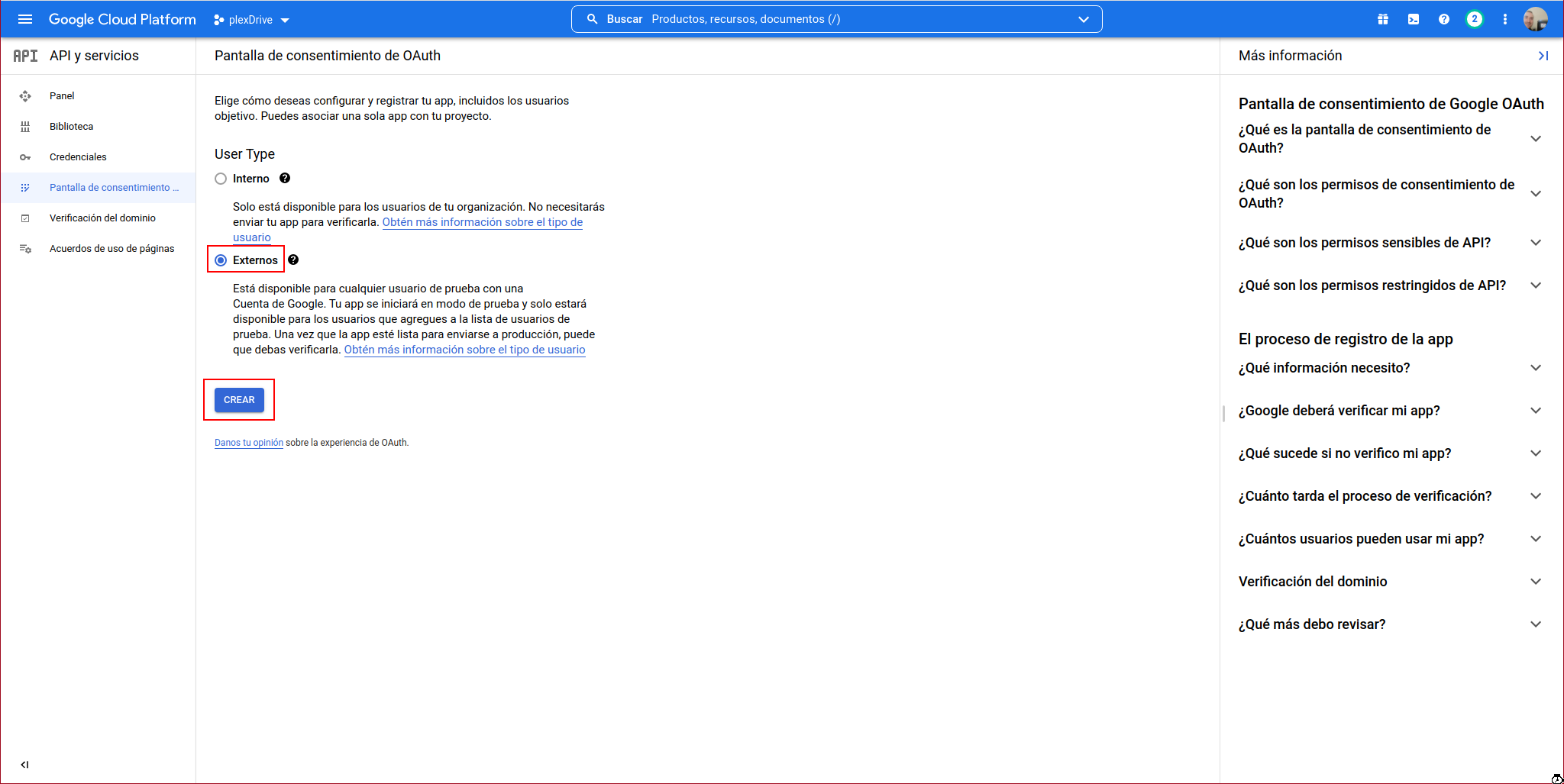 En User Type indicamos: Externos y le damos a “CREAR”: