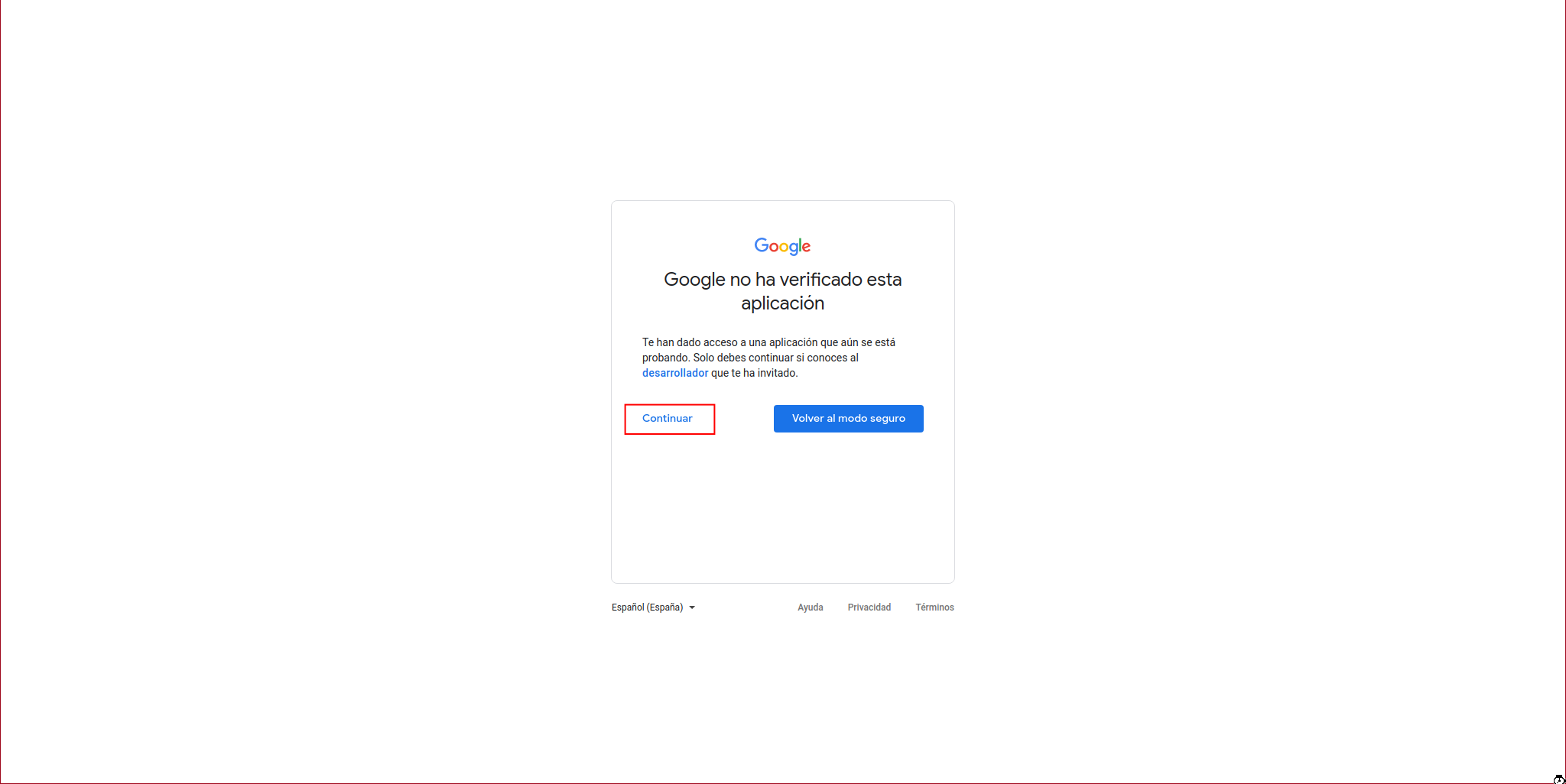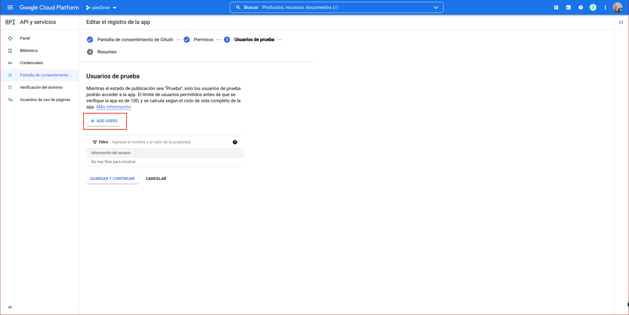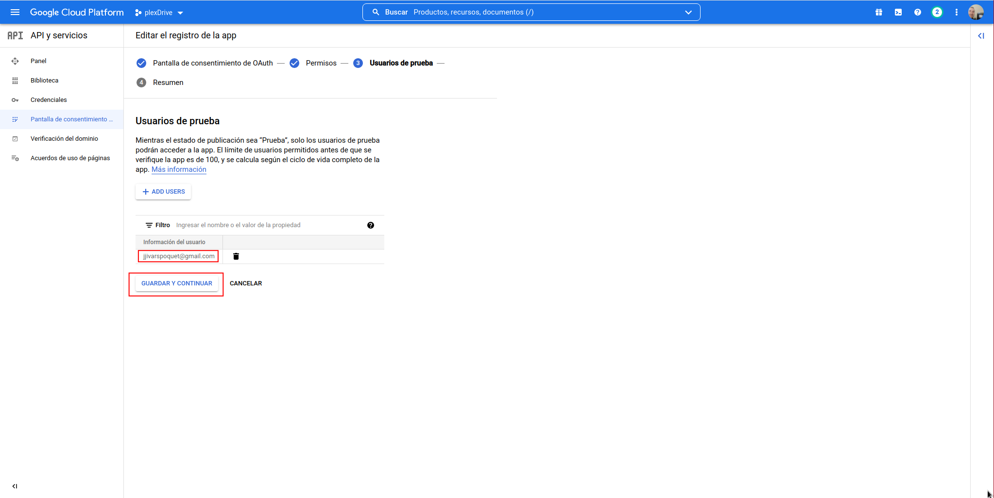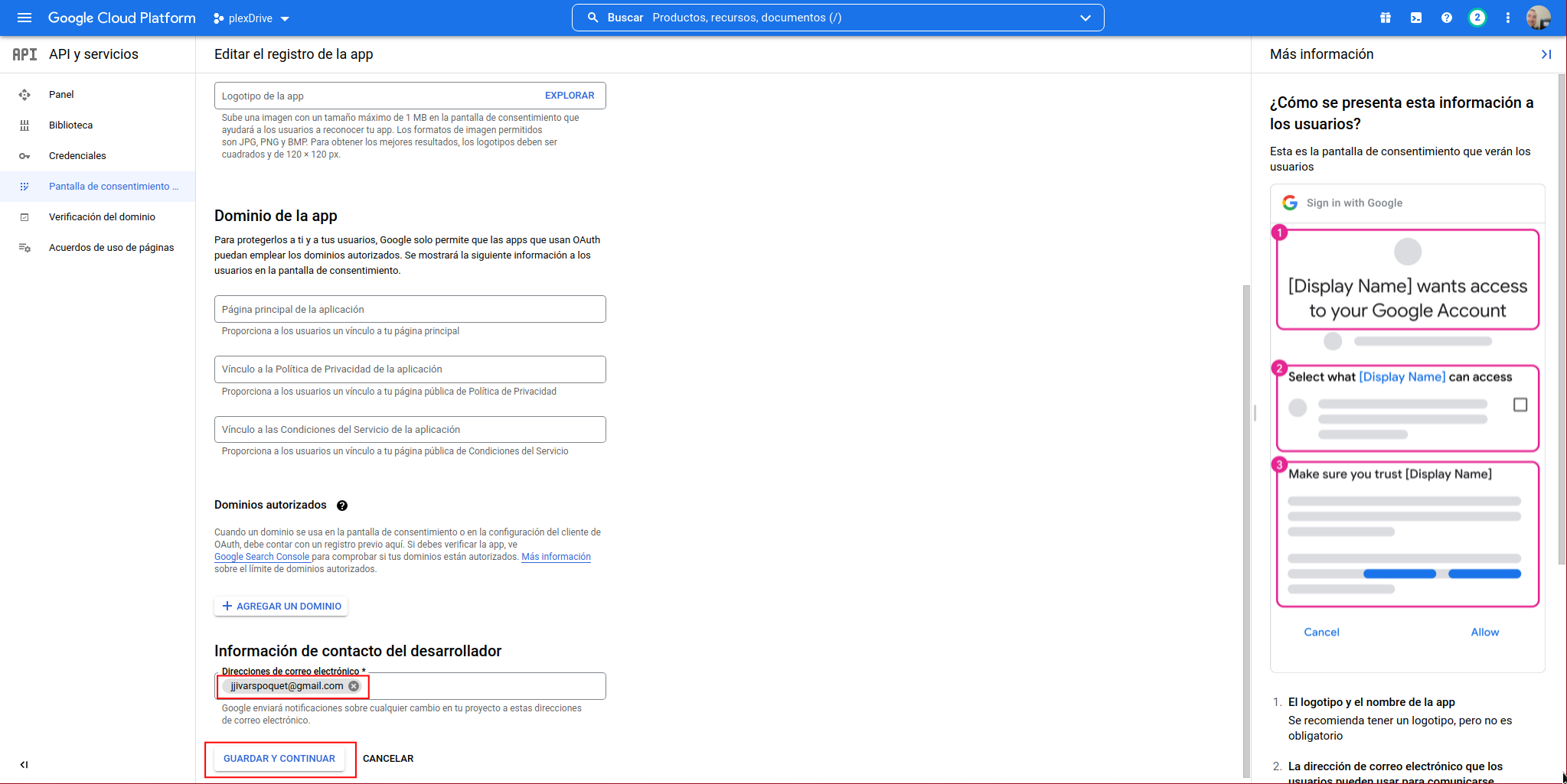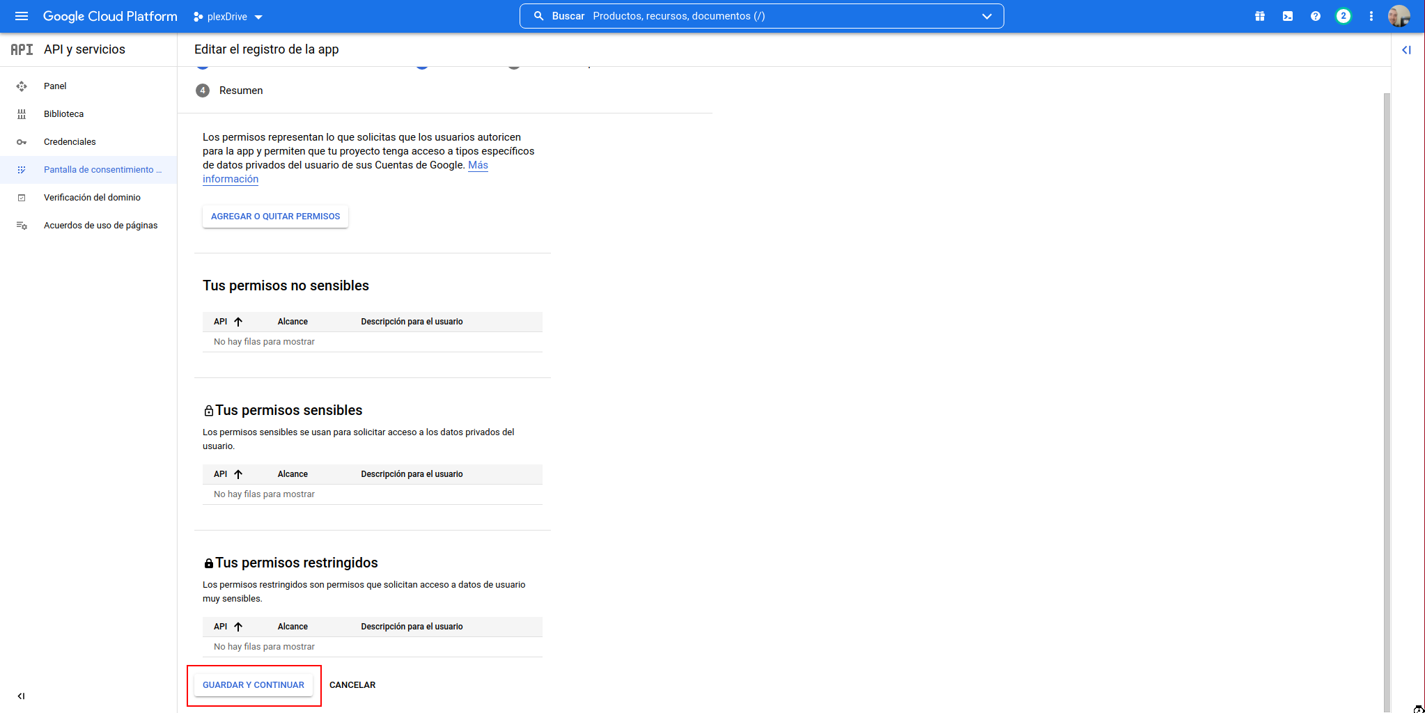 No necesitamos ningún tipo de permiso especial, asà que le damos a “GUARDAR Y CONTINUAR”:
