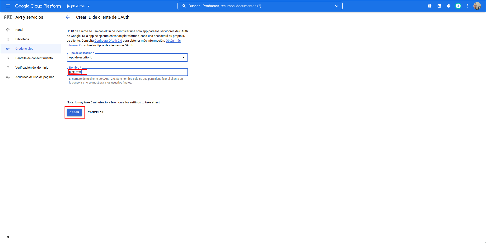 En tipo de aplicación selccionamos “App de escritorio”, le damos un nombre y clickamos sobre “CREAR”: