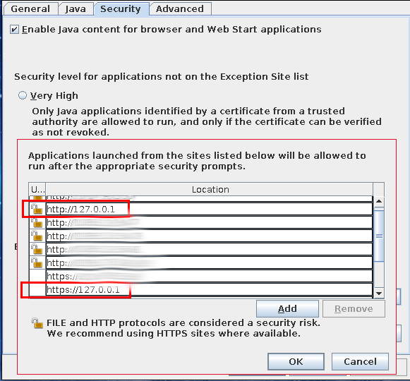 Añadimos la ip loopback a la lista de excepciones de Java:
