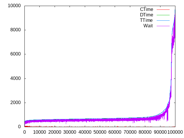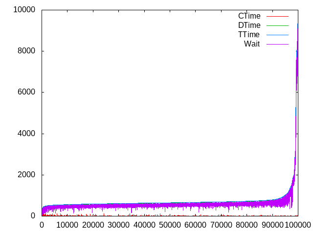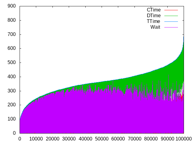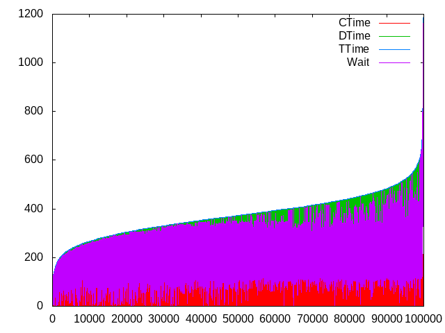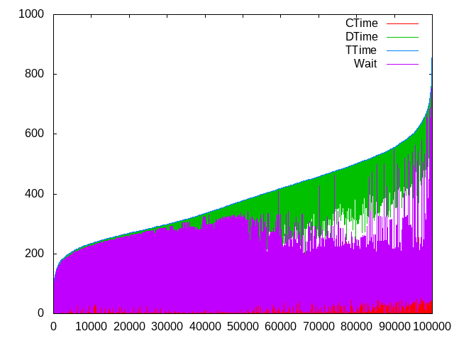 gnuplot> plot “NAME.csv” using 7 w lines title ‘CTime’, “NAME.csv” using 8 w lines title ‘DTime’, “NAME.csv” using 9 w lines title ‘TTime’, “NAME.csv” using 10 w lines title ‘Wait’