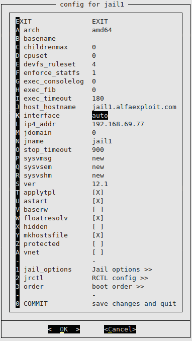 jail1 1 192.168.69.77/24,192.168.69.78/24 jail1.alfaexploit.com /usr/jails/jails/jail1 On