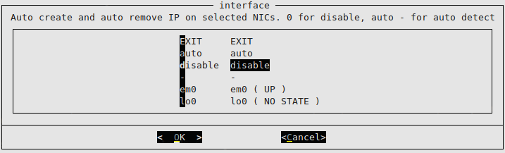 En estos casos debemos configurar las Jails para que no llamen a los scripts de configuración/desconfiguración de alias, accedemos al asistente de configuración y cambiamos la opción interface a disable: