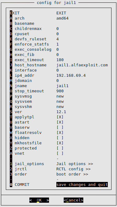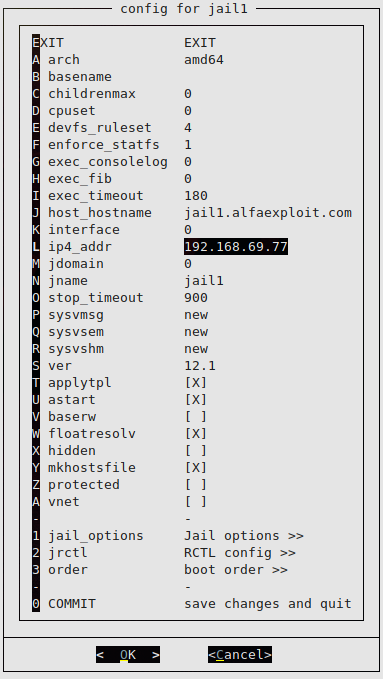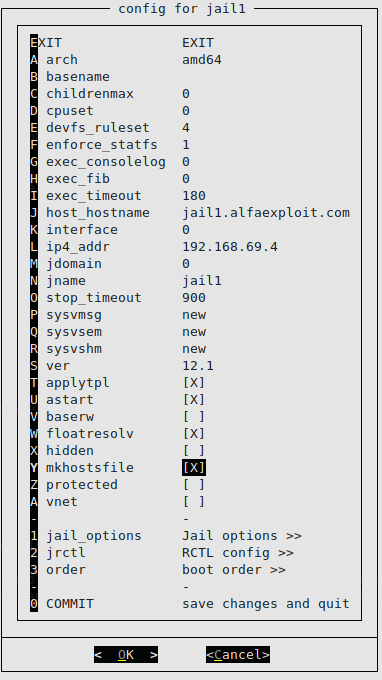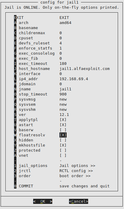 jail1 0 192.168.69.4 jail1.alfaexploit.com /usr/jails/jails/jail1 Off