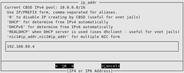 Configurar una ip puede hacerse tanto desde el asistente de creación de una Jail como por comando: