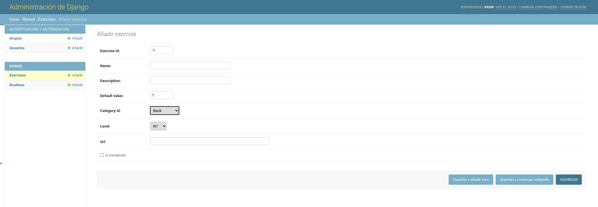 Si añadimos un ejercicio aparecerá la siguiente pantalla con los campos del modelo: