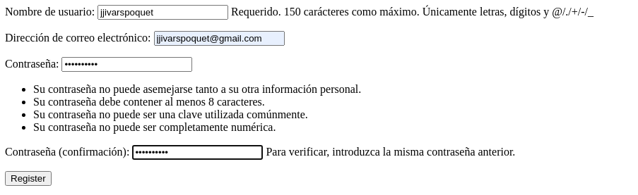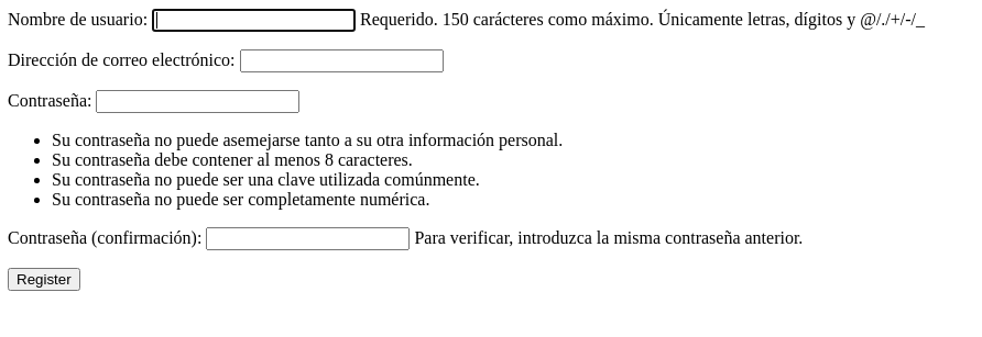 El único inconveniente es que no obliga al usuario a introducir una cuenta de email para su registro, por lo tanto vamos a crear nuestro propio formulario que extenderá de UserCreationForm con esto heredaremos las validaciones anteriores pero pudiendo modificar los campos requeridos y pudiendo realizar las validaciones que consideremos oportunas.