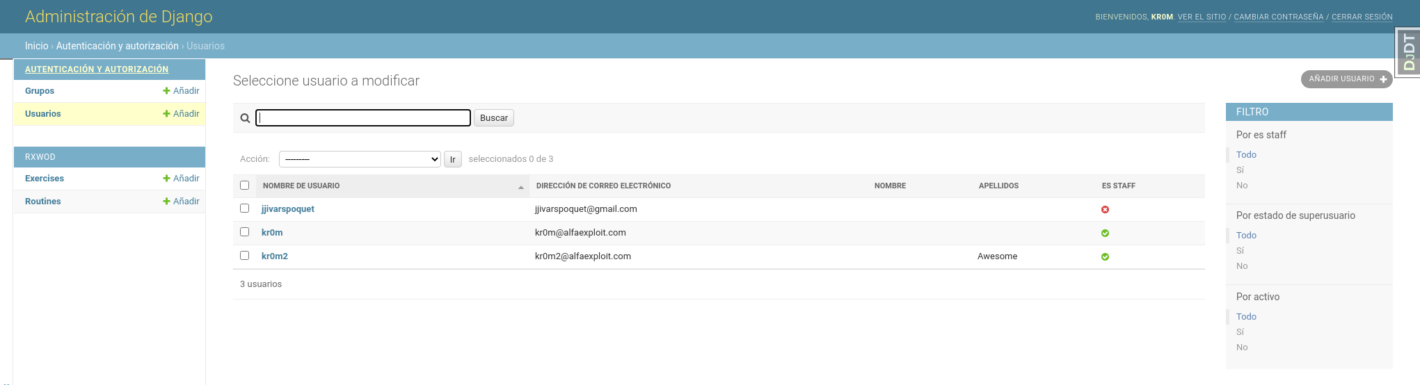 Hacemos logout/login con jjivarspoquet para comprobar que ahora solo puede ver sus rutinas:
