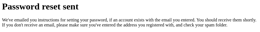 <p>We've emailed you instructions for setting your password, if an account exists with the email you entered. You should receive them shortly.<br>If you don't receive an email, please make sure you've entered the address you registered with, and check your spam folder.</p>