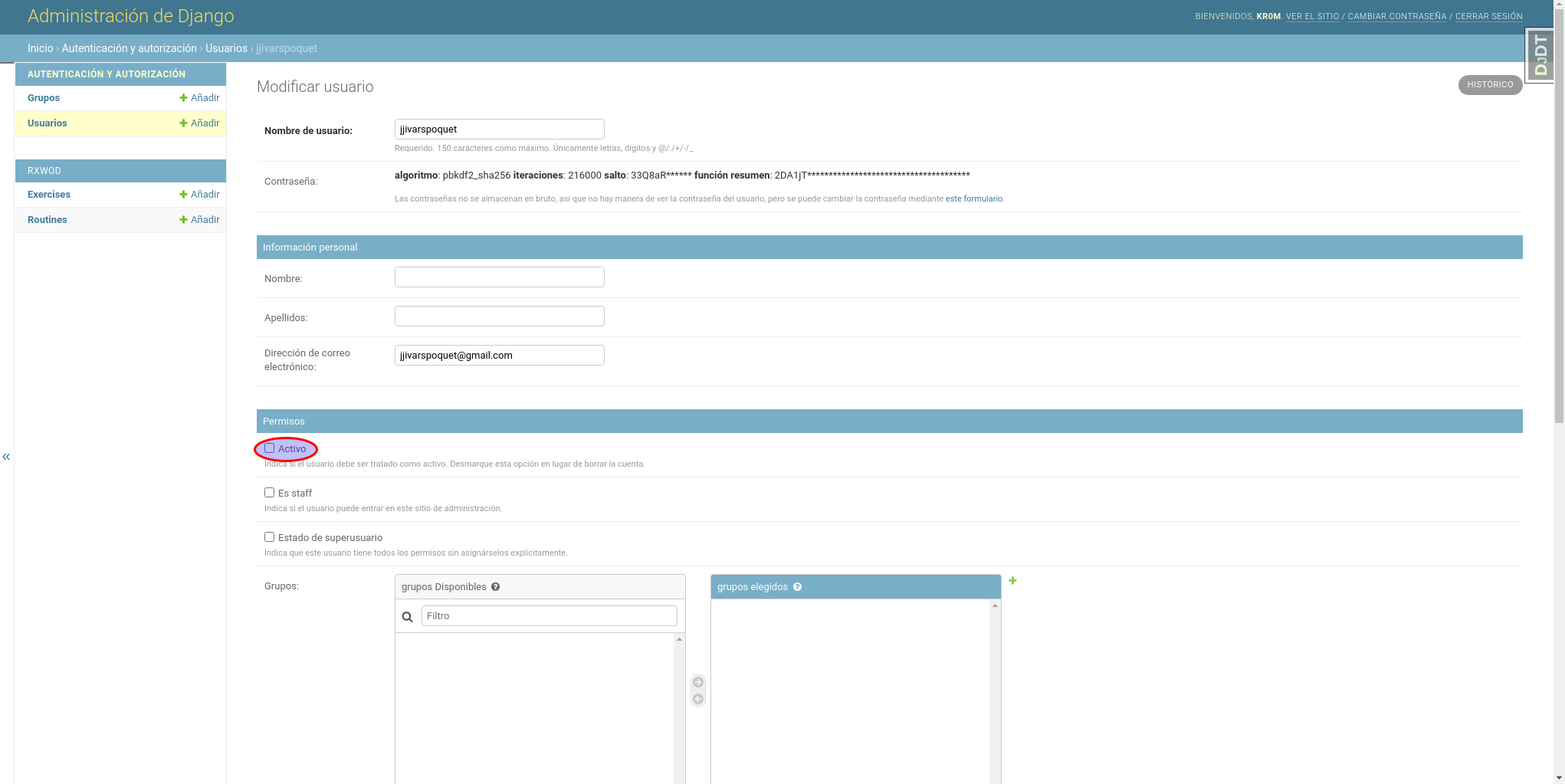 Para hacer la prueba vamos a editar el estado del usuario jjivarspoquet y lo pasamos a inactivo: