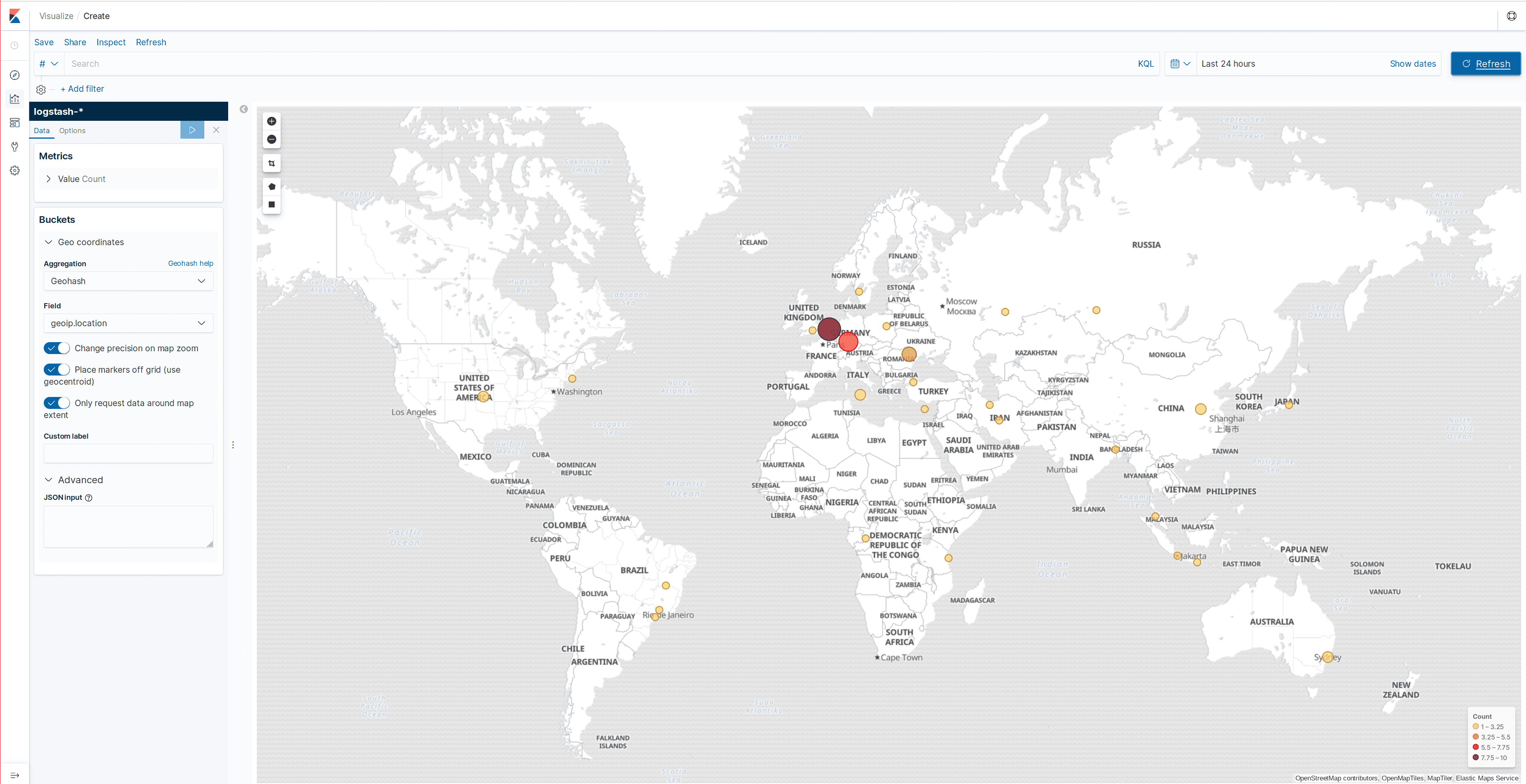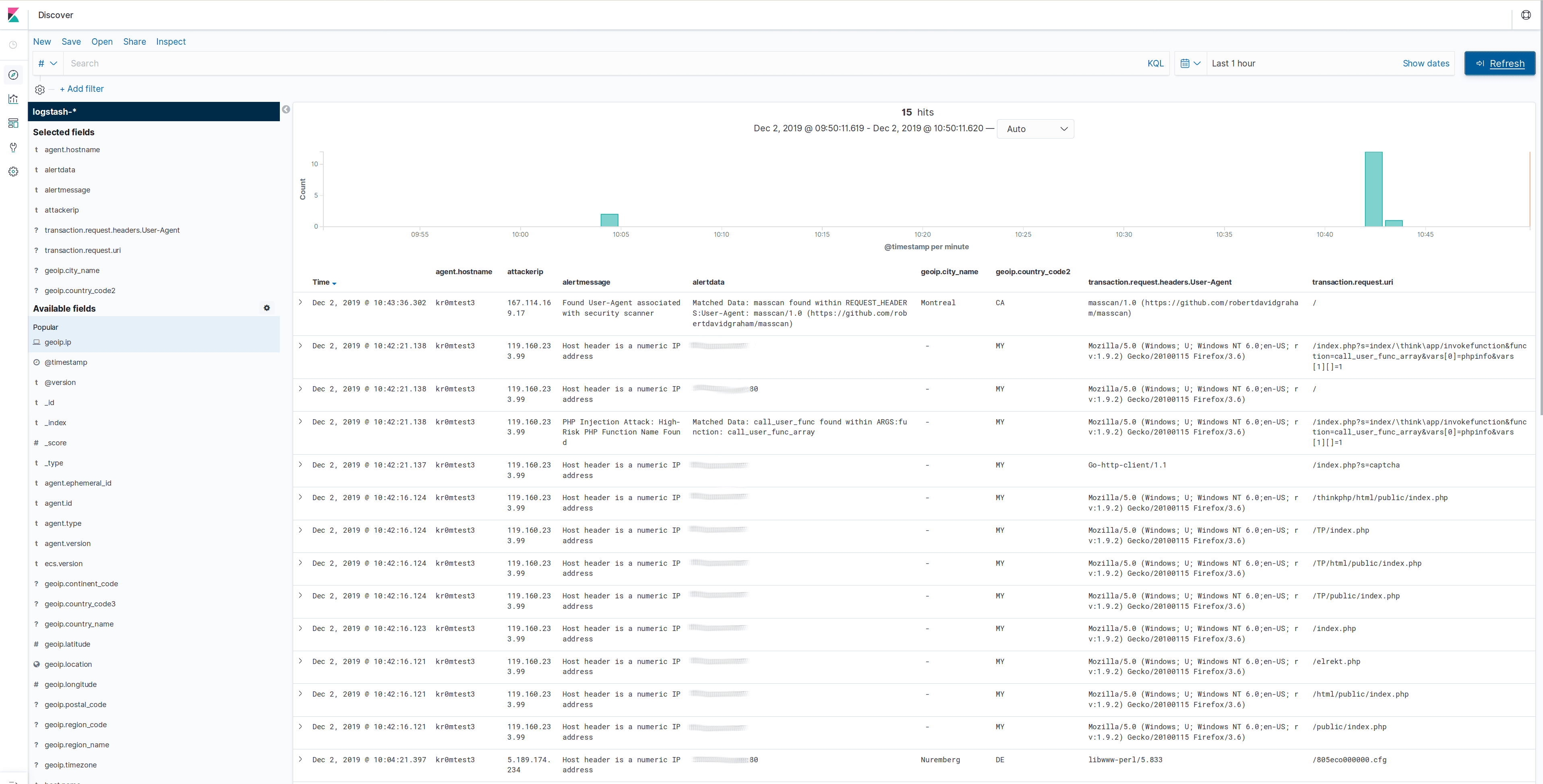 Elasticsearch junto con Kibana nos permite visualizar de forma muy rápida y sencilla datos recolectados sin necesidad de programar ninguna interfaz web ni similar, por ese motivo vamos a integrar los logs de libmodsecurity con Elasticsearch. Podremos ver la lista de alertas, filtrar por diferentes campos y visualizar los ataques geolocalizándolos en un mapa.