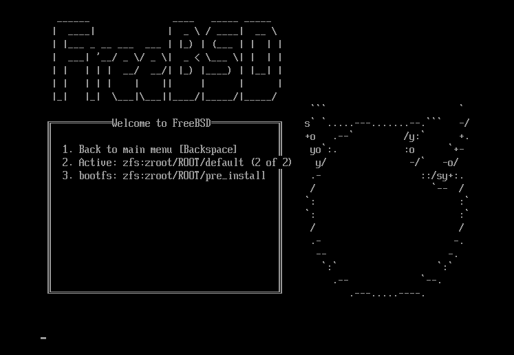 Por defecto arrancará el “boot environment” que le hayamos indicado pero podemos sobreescribir la configuración de forma manual desde el propio boot de FreeBSD, accedemos a la siguiente opción:
