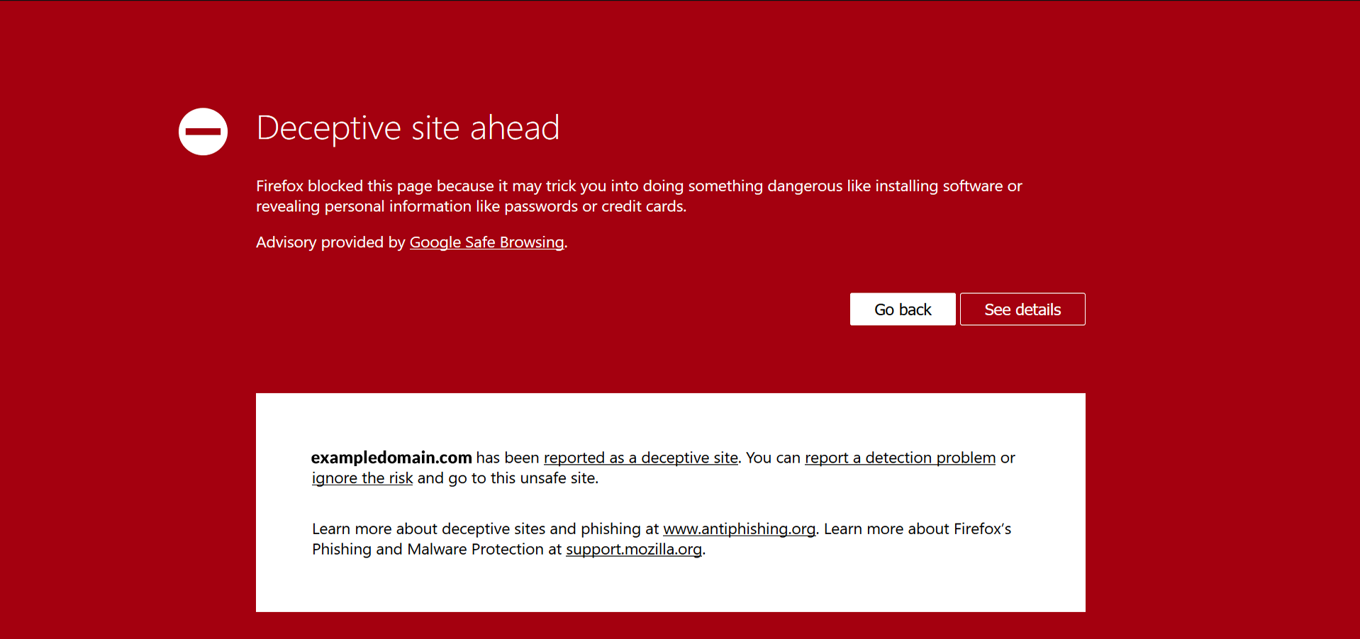 Si estuviese blacklisteada nos dirÃa True y al intentar acceder por el navegador verÃamos la siguiente página de advertencia: