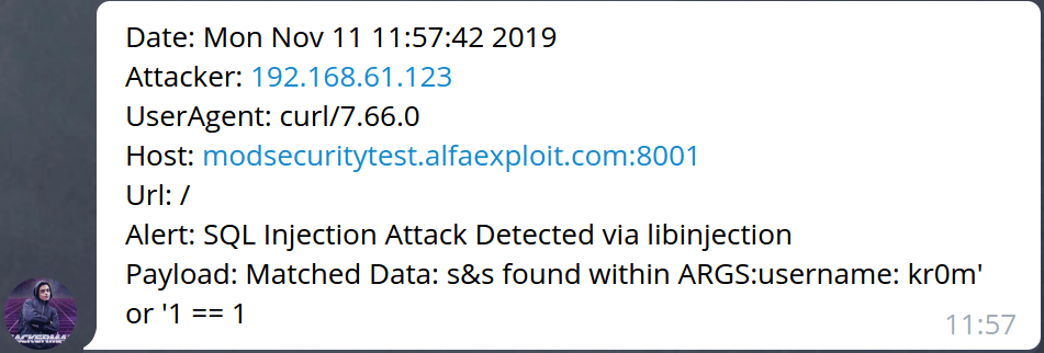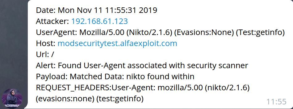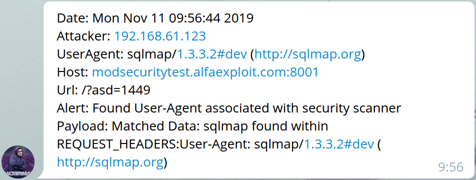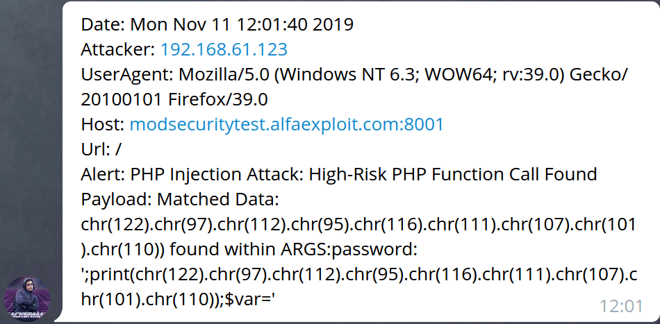 msg = 'Date: ' + str(timestamp) + '\nAttacker: ' + str(attacker) + '\nUserAgent: ' + str(useragent) + '\nHost: ' + str(host) + '\nUrl: ' + str(url) + '\nAlert: ' + str(message) + '\nPayload: ' + str(payload)