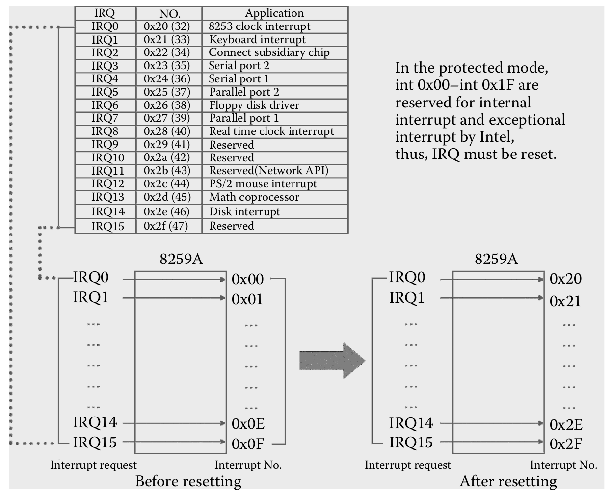 Las interrupciones del modo protegido abarcan los ids de interrupción 0x00-0x1F(0-31), por lo tanto quedan libres 0x20-0x1f(32-255), es en este último rango donde vamos a remapear las interrupciones originales de los PICs.