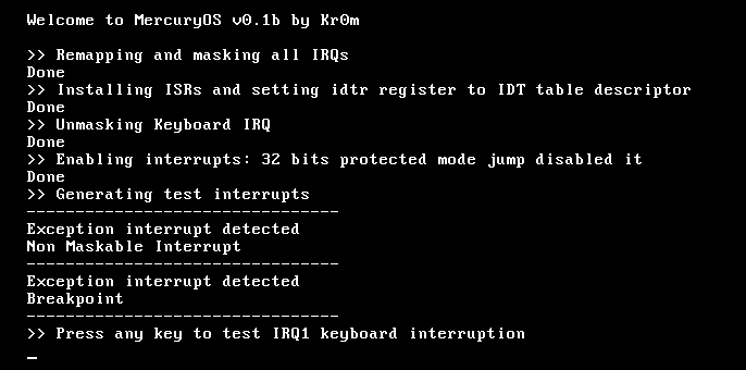 Finalmente remapeamos las IRQs e instalamos las ISRs desde la función principal del kernel, generamos algunas interrupciones por código y nos mantenemos a la espera de que se pulse alguna tecla del teclado, si esto ocurre leemos la tecla para liberar el buffer del teclado y así poder seguir generando interrupciones pulsando teclas, todavía no leemos el código de la tecla.