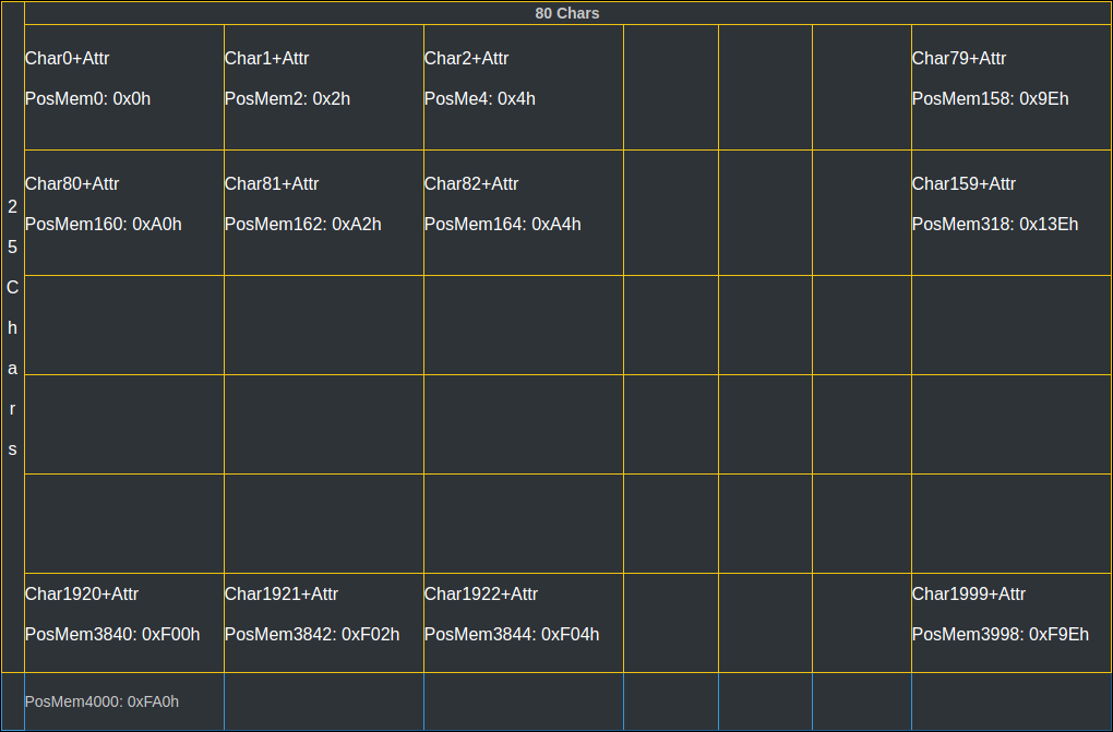 Como ya explicamos en artículos anteriores cada carácter en pantalla está compuesto por un carácter ASCII mas su atributo, esto implica que cada carácter ocupa 2 bytes en memoria, además los carácteres se distribuyen en una matriz de 25x80 carácteres que conforman la totalidad de la pantalla.