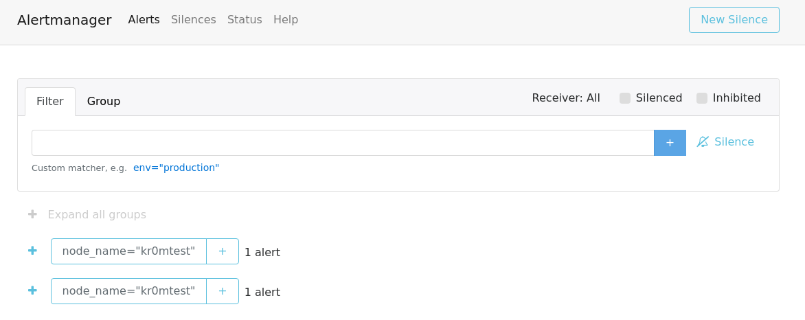 Silence: http://pmm.alfaexploit.com:9093/#/silences/new?filter=%7Balertgroup%3D%22{{.Labels.alertgroup}}%22%2C%20alertname%3D%22{{.Labels.alertname}}%22%2C%20node_name%3D%22{{.Labels.name}}%22%2C%20severity%3D%22{{.Labels.severity}}%22%7D