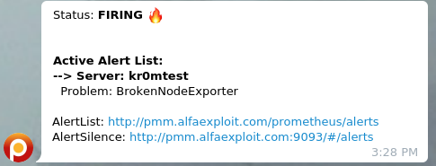 Silence: http://pmm.alfaexploit.com:9093/#/silences/new?filter=%7Balertgroup%3D%22{{.Labels.alertgroup}}%22%2C%20alertname%3D%22{{.Labels.alertname}}%22%2C%20node_name%3D%22{{.Labels.server}}%22%2C%20severity%3D%22{{.Labels.severity}}%22%7D