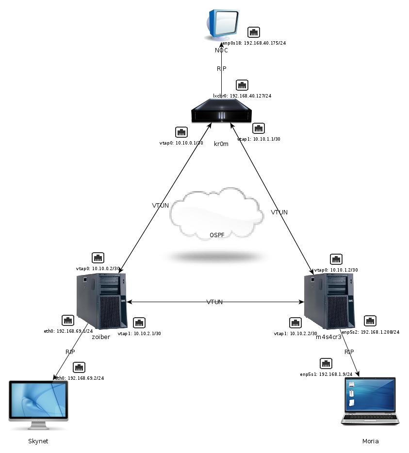 En este mini howto supondremos que disponemos del siguiente escenario, tres redes independientes con direccionamiento interno con acceso al exterior, cada red se comunica a través de un router de salida con una única dirección ip wan, además en cada red dispondremos de un servidor que actuará de nexo de interconexión entre redes internas mediante túneles creados con vtun, en cada red interna donde haya un server actuando como server-vtun deberemos redirigir el puerto utilizado por vtun a dicho server, en mi caso en kr0m y zoiber.