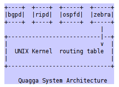 A la derecha la estructura interna de quagga donde podemos ver que cada demonio se encarga de un protocolo de enrutamiento especifico los cuales informan a zebra y es este el que pushea las rutas en la tabla de enrutamiento del sistema operativo.